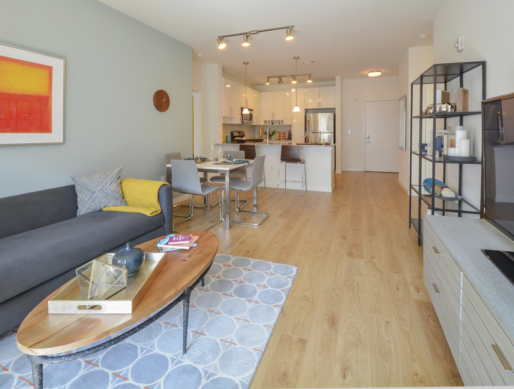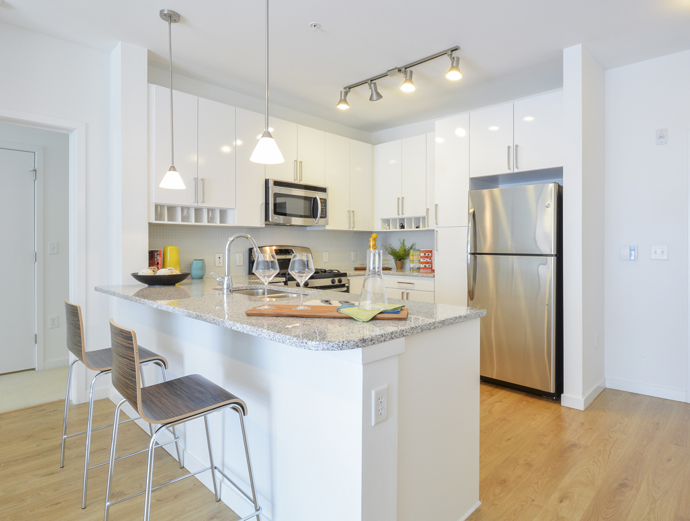 As you explore our expansive layouts, you’ll find gourmet kitchens that gleam with high-end finishes, including sleek stainless steel appliances, stunning glass tile backsplashes, and stylish wood-inspired floors. Boasting plenty of panoramic windows, our bright and open living spaces are beaming with natural light. Select floor plans also feature a private patio or balcony that showcases scenic poolside, courtyard, or city views. In-home laundry appliances are also available in every apartment.