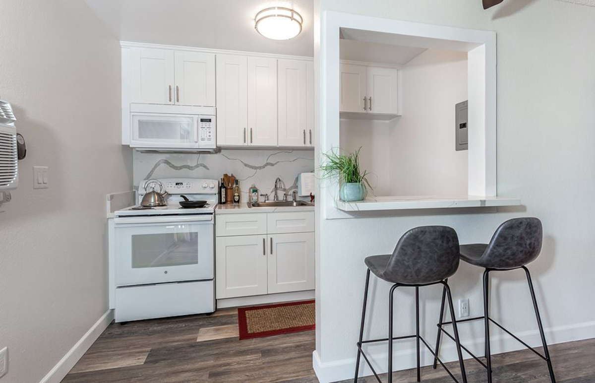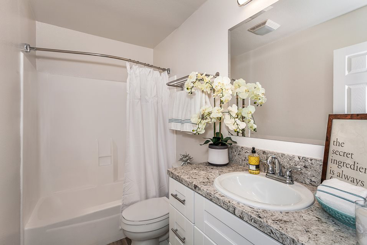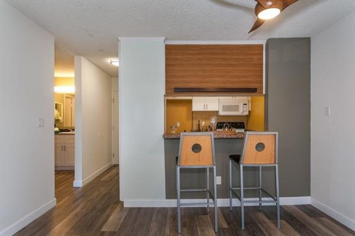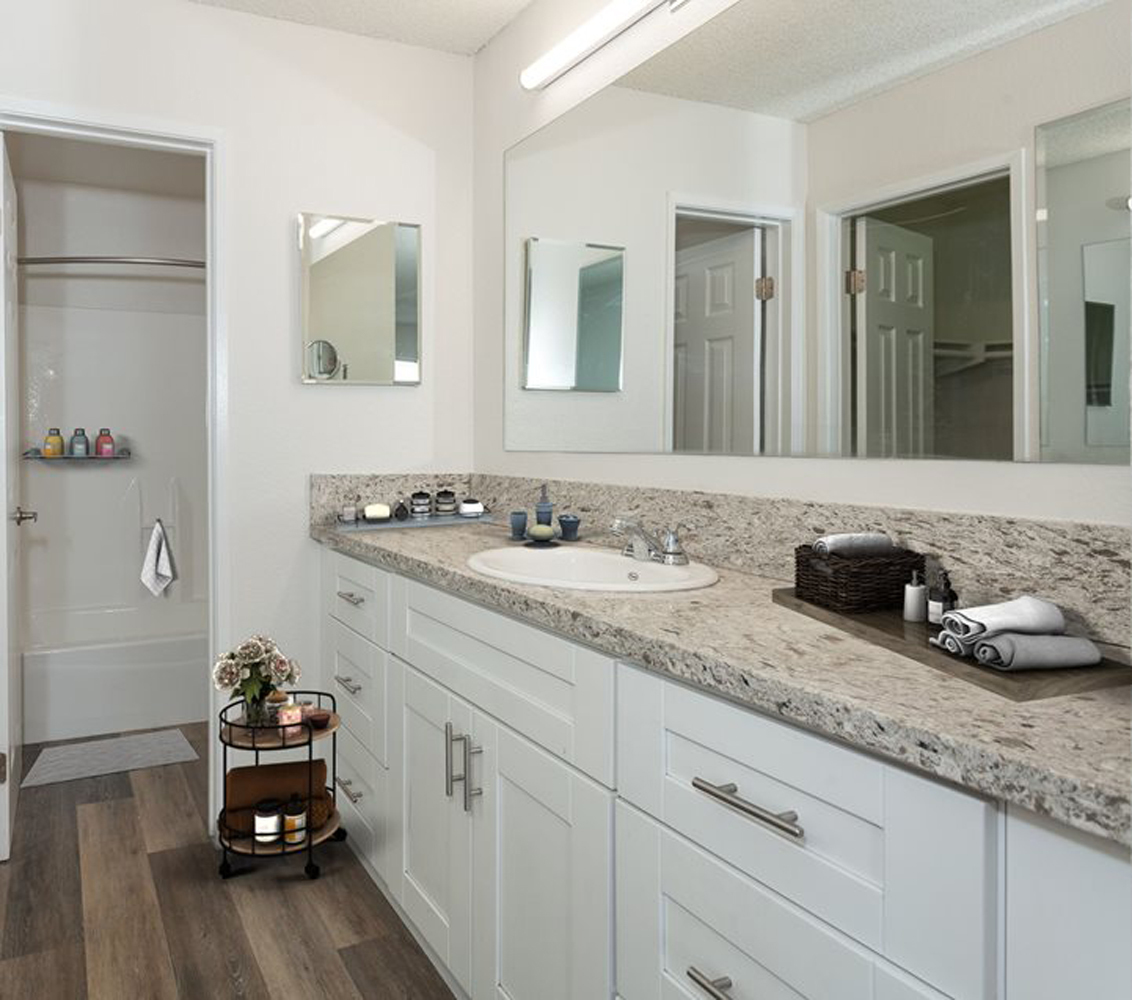 Our custom-designed studio, one, and two-bedroom floor plans come with elegant finishes in every room. Choose between plank wood flooring or designer carpeting to match the custom accent walls. For ultimate comfort, ceiling fans and energy-efficient air conditioning combine to maintain your ideal atmosphere, while sunshine from large patios or balconies brightens our welcoming living spaces. Everyday cooking is a pleasure with select homes boasting modern kitchens with new cabinets, quartz or Formica countertops, and travertine tile backsplashes. Pamper yourself in a spa-inspired bathroom with granite countertops. New vanity cabinets and walk-in closets are also available in select apartments.