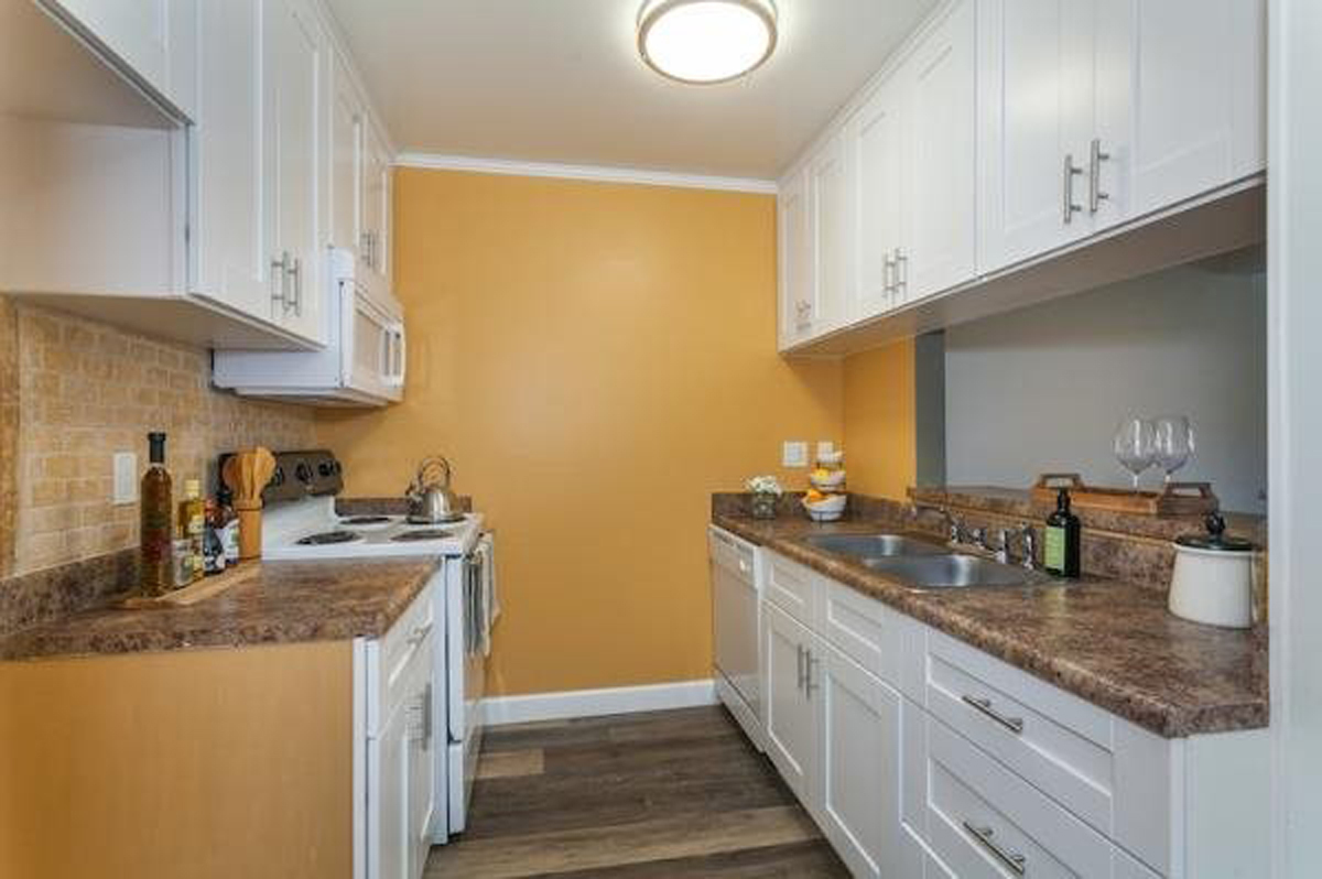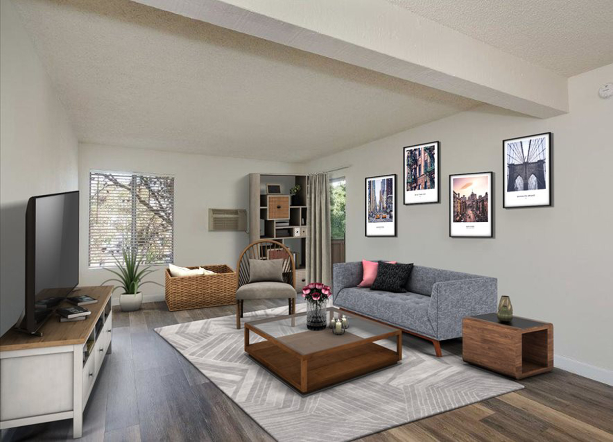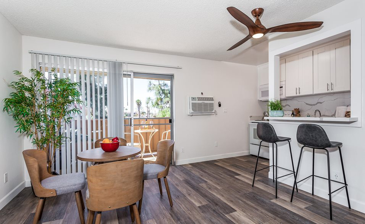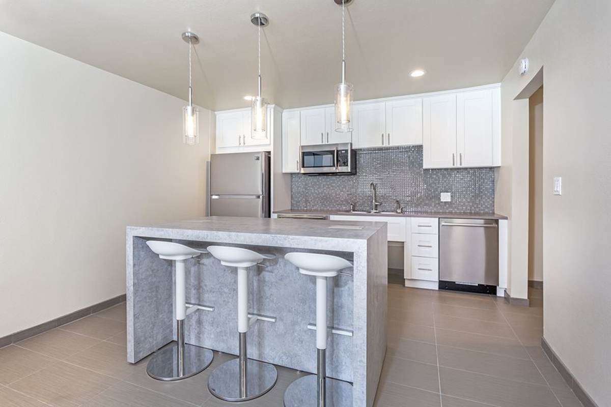 Our custom-designed studio, one, and two-bedroom floor plans come with elegant finishes in every room. Choose between plank wood flooring or designer carpeting to match the custom accent walls. For ultimate comfort, ceiling fans and energy-efficient air conditioning combine to maintain your ideal atmosphere, while sunshine from large patios or balconies brightens our welcoming living spaces. Everyday cooking is a pleasure with select homes boasting modern kitchens with new cabinets, quartz or Formica countertops, and travertine tile backsplashes. Pamper yourself in a spa-inspired bathroom with granite countertops. New vanity cabinets and walk-in closets are also available in select apartments.