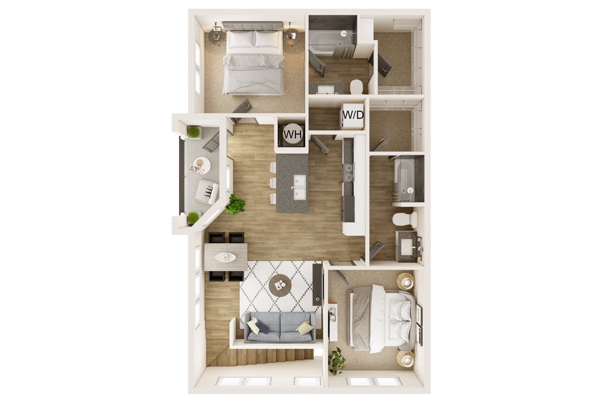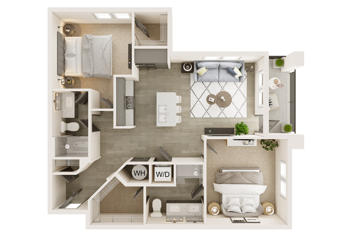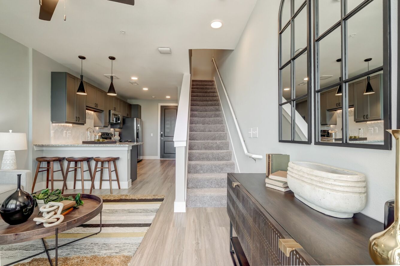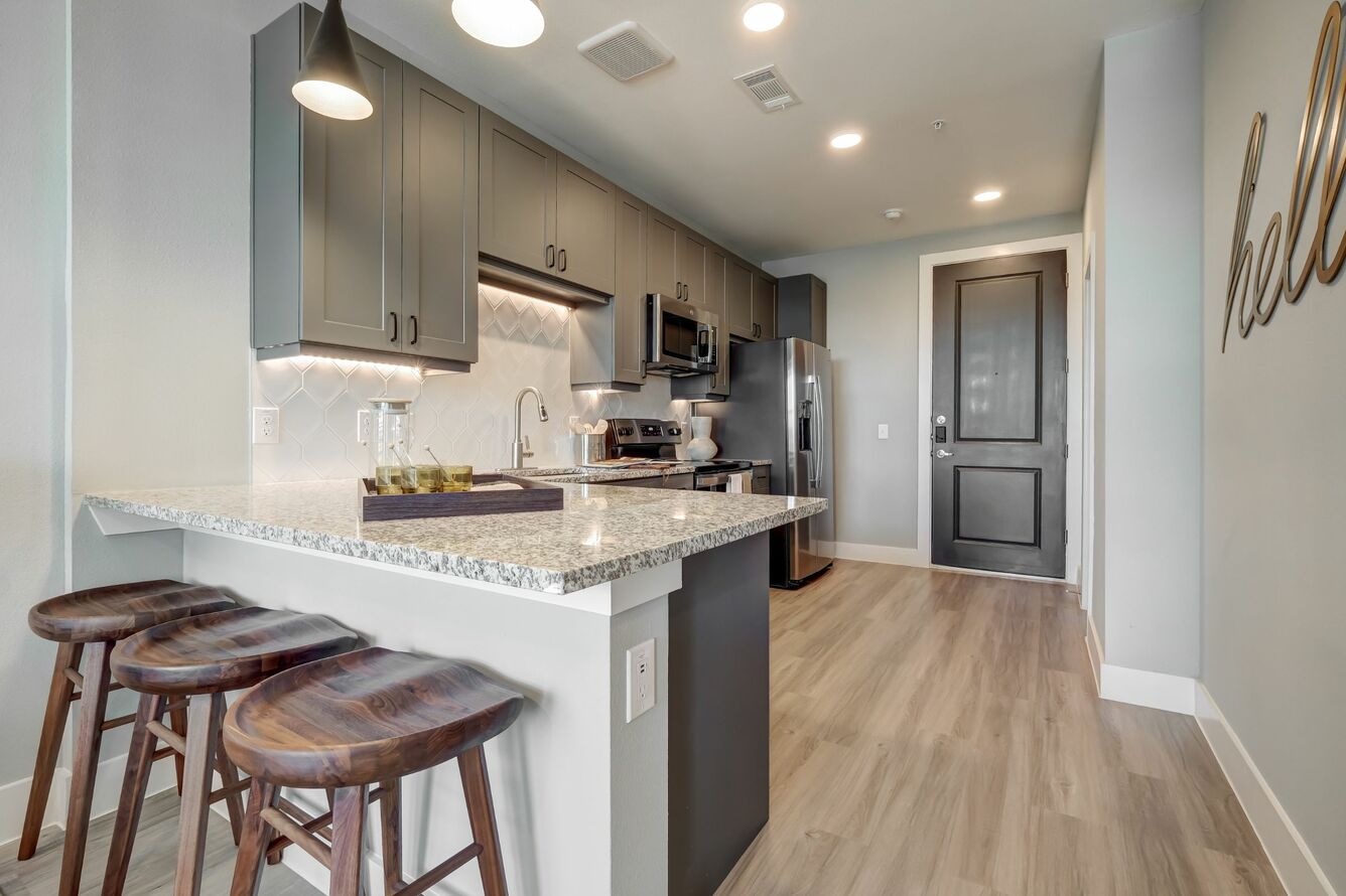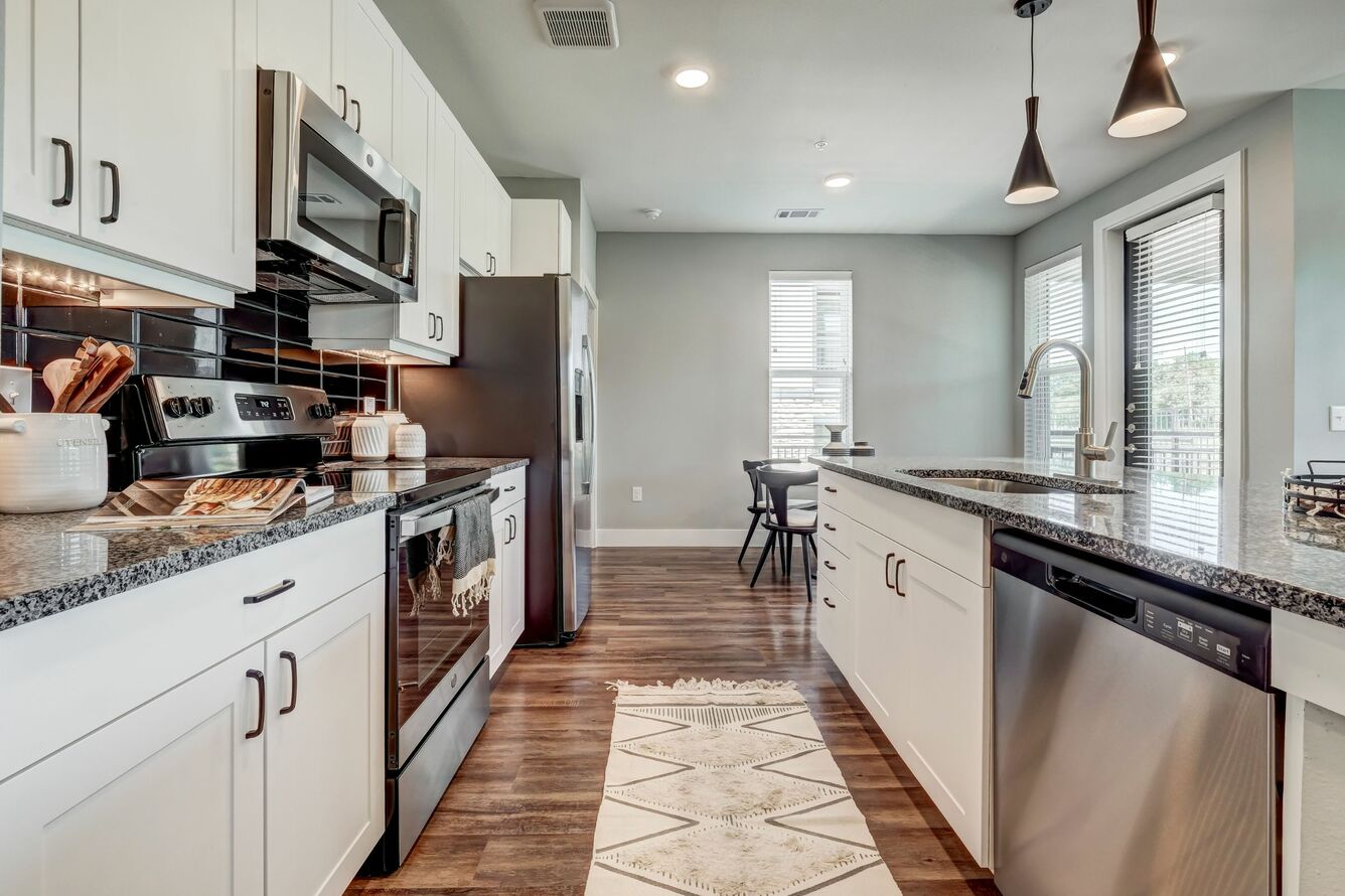 No matter which layout you choose, you can look forward to delightful cooking experiences in your designer kitchen with stainless-steel appliances, quartz countertops, and white or warm gray finished cabinets. Spacious walk-in closets make staying organized a snap, while smart-home features, USB charging outlets, and in-home laundry appliances allow you to enjoy a life of ease.