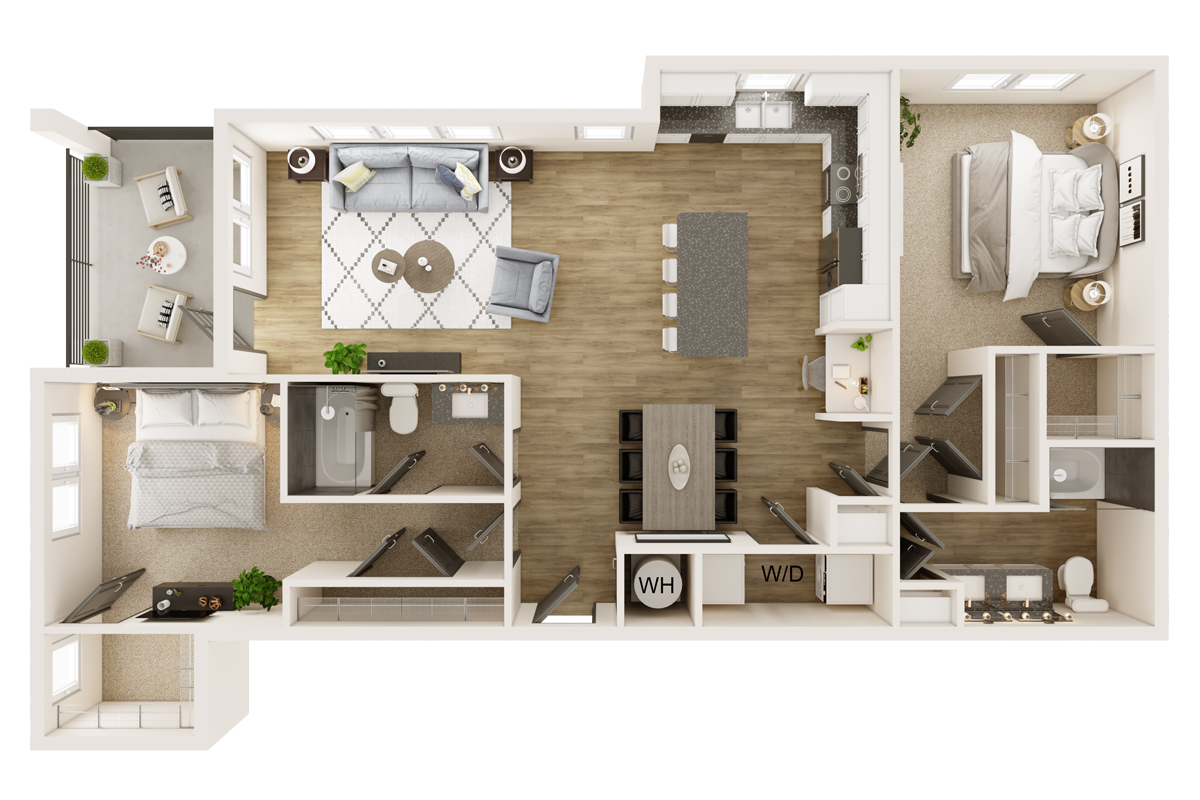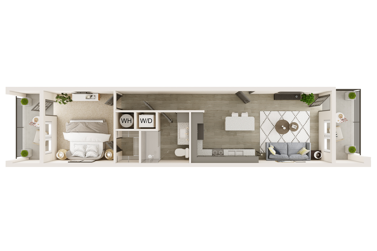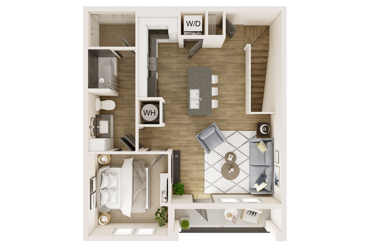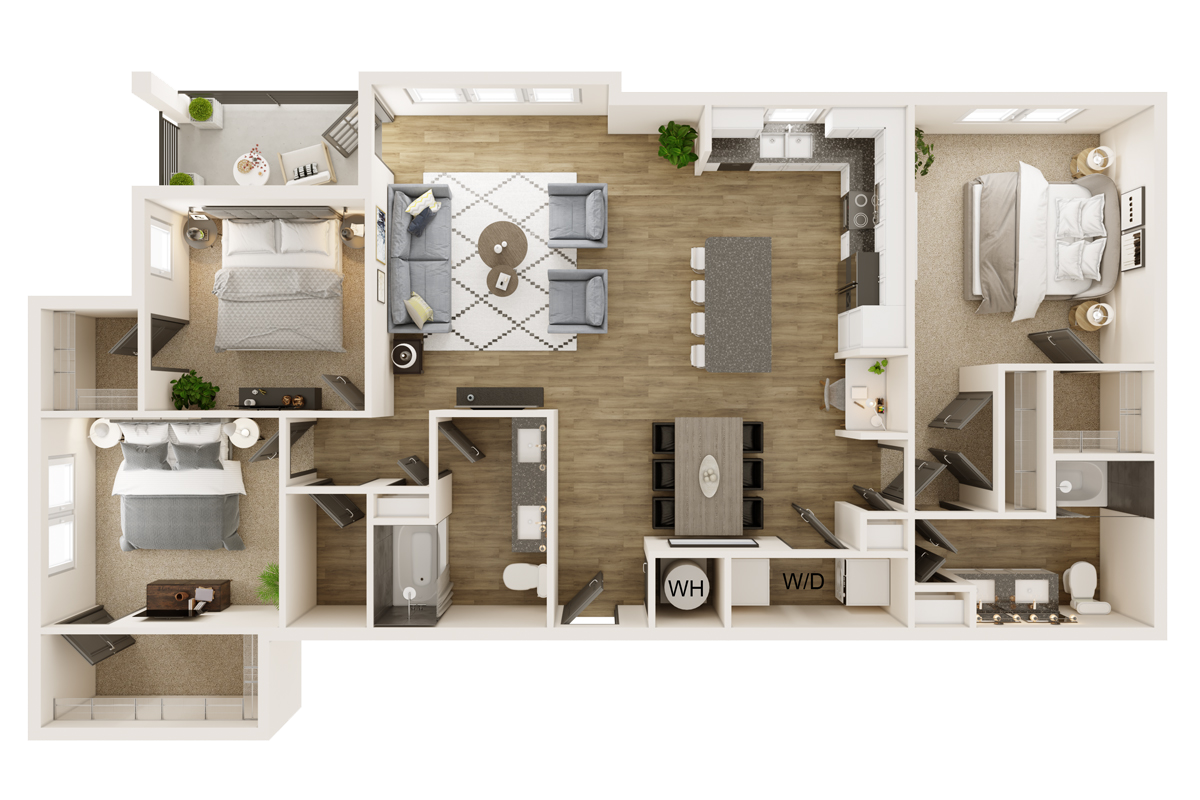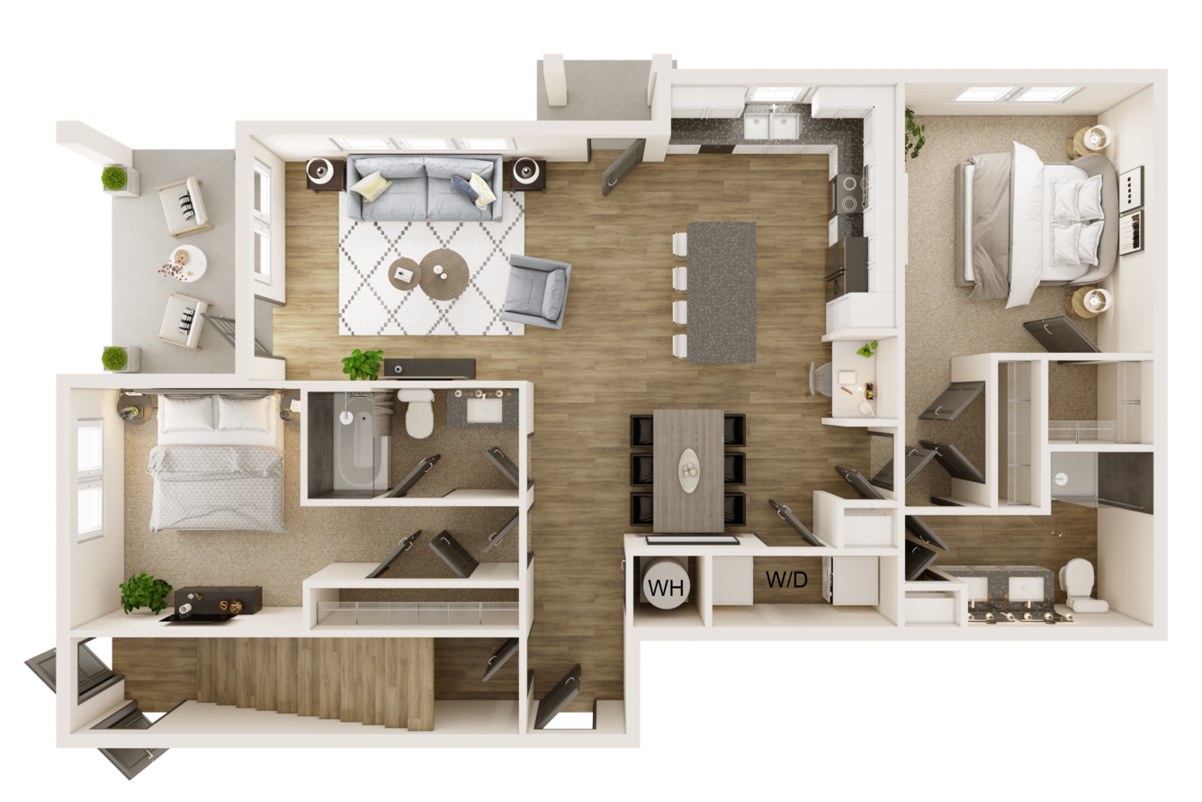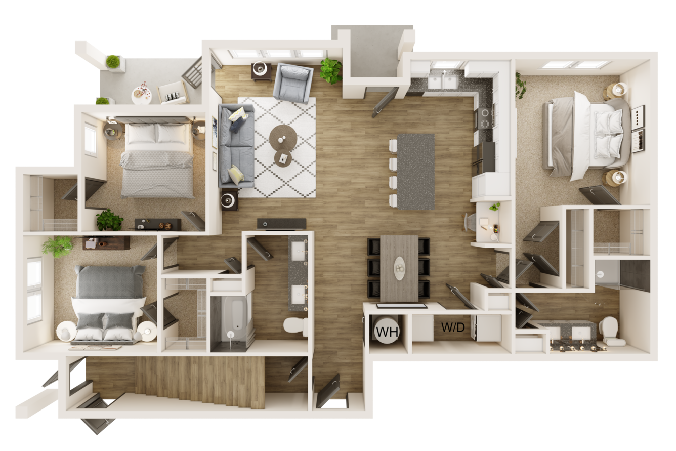 No matter which layout you choose, you can look forward to delightful cooking experiences in your designer kitchen with stainless-steel appliances, quartz countertops, and white or warm gray finished cabinets. Spacious walk-in closets make staying organized a snap, while smart-home features, USB charging outlets, and in-home laundry appliances allow you to enjoy a life of ease.
