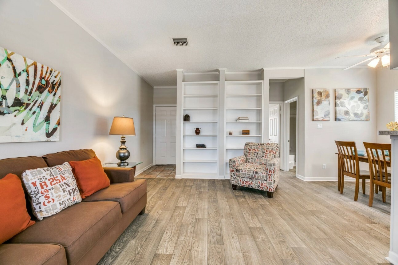 Inside your apartment, options such as wood-style flooring and built-in bookshelves deliver a timeless look while a stylish black appliance package in the kitchen provides some contemporary appeal. Ample cabinet and counter space, as well as a convenient breakfast bar, add even more functionality to your cooking space. To enhance your overall comfort, roomy closets, carpeted bedrooms, and attached patios and balconies help make you feel right at home. You can take in the picturesque community views from home or explore the amenities. Relax under a poolside cabana with some fresh barbecue from the grilling area. Reach your fitness goals with the professional equipment in the fitness center or ensure your dog gets some exercise courtesy of the on-site pet park. A clubhouse with laundry facilities and a computer center is also available.
