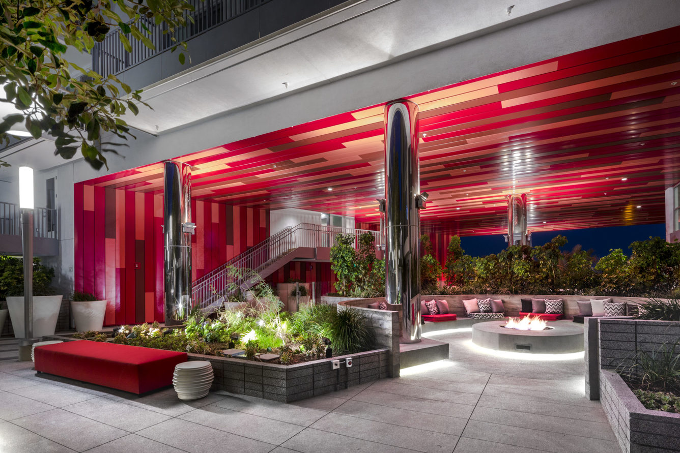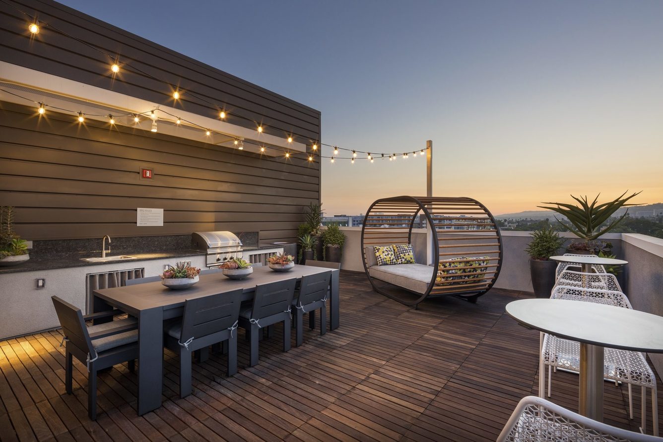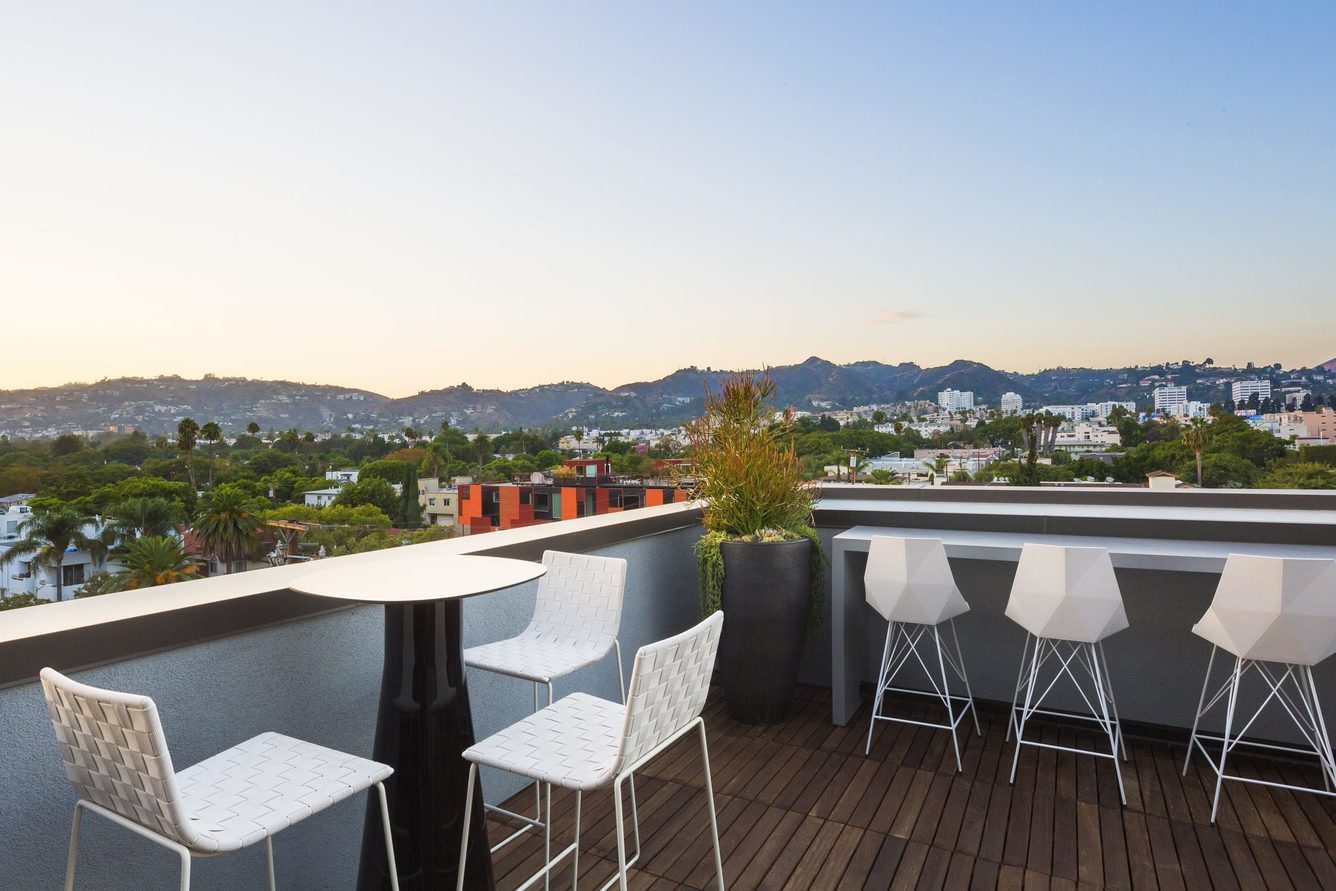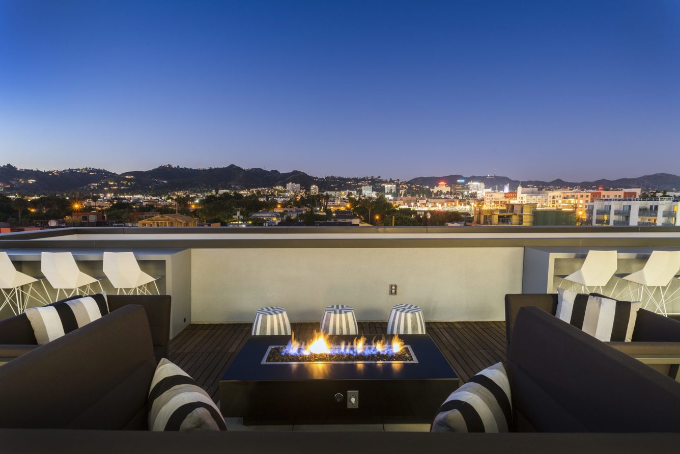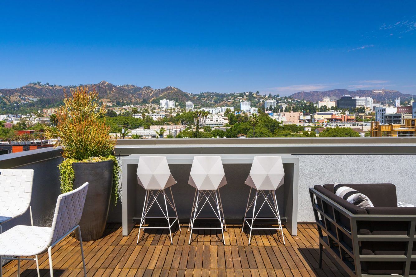 Sixth floor homes come with 12-foot ceilings and ground floor options include alternative concrete flooring. Our generous windows with roller shades offer an abundance of natural light, adjustable to your liking. Our contemporary urban kitchens boast quartz countertops with full height Porcelanosa tile backsplashes, European style cabinetry, and GE stainless steel appliances alongside Moen plumbing fixtures. From the matching Porcelanosa tiles surrounding the showers and oversized soaking tubs, to the quartz countertops with framed vanity mirrorsand porcelain tile flooring, you’ll love every detail of our bathrooms. The deluxe lifestyle amenities continue throughout our community, from the pool with a spa and sun deck, to the outdoor kitchen with BBQ grills, a pizza oven, and a communal dining space. Take full advantage of our coveted rooftop views of the spectacular Hollywood Hills and LA skyline, either via our indoor or outdoor Sky Lounge patio featuring a gourmet kitchen, or from our outdoor firepit with loungeseating overlooking the Hollywood sign. Keep looking and feeling fresh at our state-of-the-art fitness studio featuring Technogym equipment, a barre and stretch room, and even pet wash stations. In addition to our location’s phenomenal 94% walkability score, making us a pedestrian’s paradise, we also offer gated garage parking with storage lockers and bicycle storage so you can traverse the city however you please. We are mere steps from many restaurants like Jones Café, but if you’re planning a night in, we also offer on-site grocery delivery through Yummy.com.