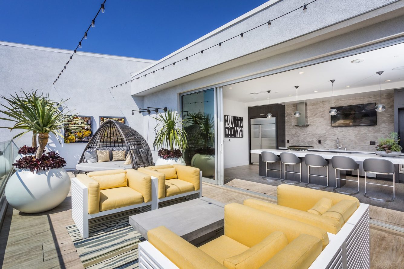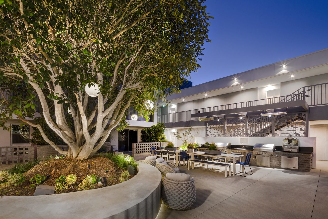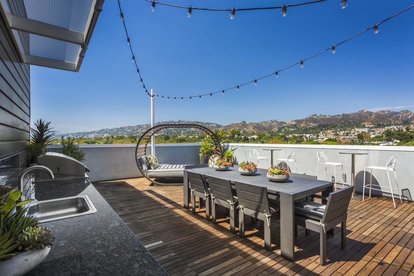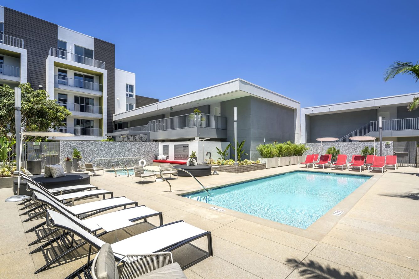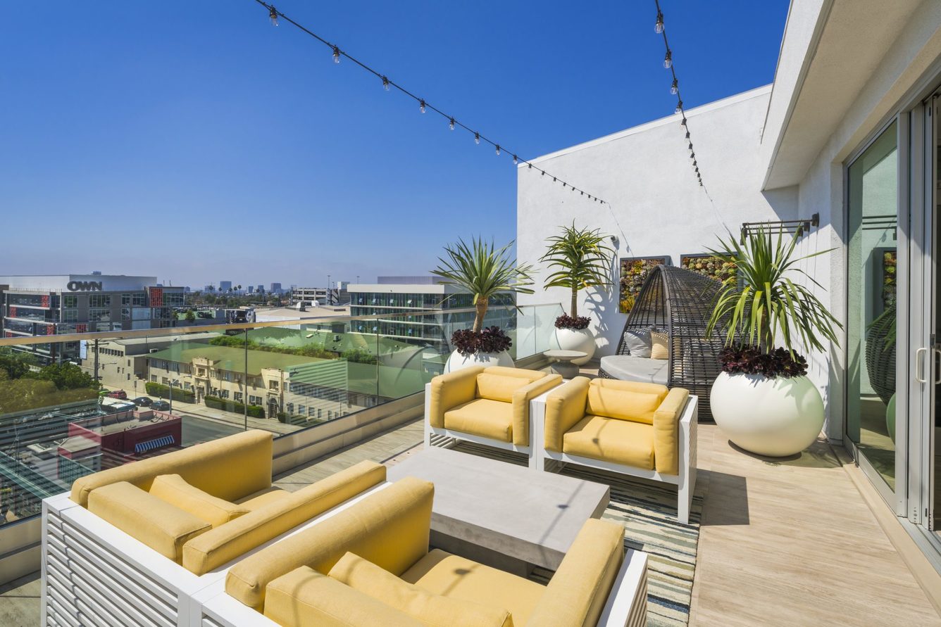 Sixth floor homes come with 12-foot ceilings and ground floor options include alternative concrete flooring. Our generous windows with roller shades offer an abundance of natural light, adjustable to your liking. Our contemporary urban kitchens boast quartz countertops with full height Porcelanosa tile backsplashes, European style cabinetry, and GE stainless steel appliances alongside Moen plumbing fixtures. From the matching Porcelanosa tiles surrounding the showers and oversized soaking tubs, to the quartz countertops with framed vanity mirrorsand porcelain tile flooring, you’ll love every detail of our bathrooms. The deluxe lifestyle amenities continue throughout our community, from the pool with a spa and sun deck, to the outdoor kitchen with BBQ grills, a pizza oven, and a communal dining space. Take full advantage of our coveted rooftop views of the spectacular Hollywood Hills and LA skyline, either via our indoor or outdoor Sky Lounge patio featuring a gourmet kitchen, or from our outdoor firepit with loungeseating overlooking the Hollywood sign. Keep looking and feeling fresh at our state-of-the-art fitness studio featuring Technogym equipment, a barre and stretch room, and even pet wash stations. In addition to our location’s phenomenal 94% walkability score, making us a pedestrian’s paradise, we also offer gated garage parking with storage lockers and bicycle storage so you can traverse the city however you please. We are mere steps from many restaurants like Jones Café, but if you’re planning a night in, we also offer on-site grocery delivery through Yummy.com.
