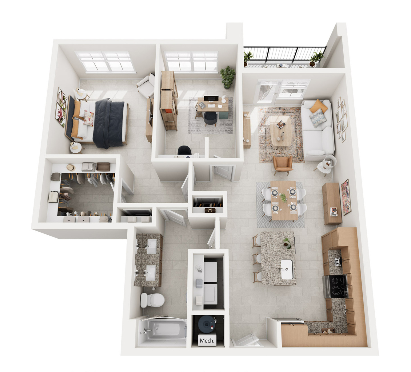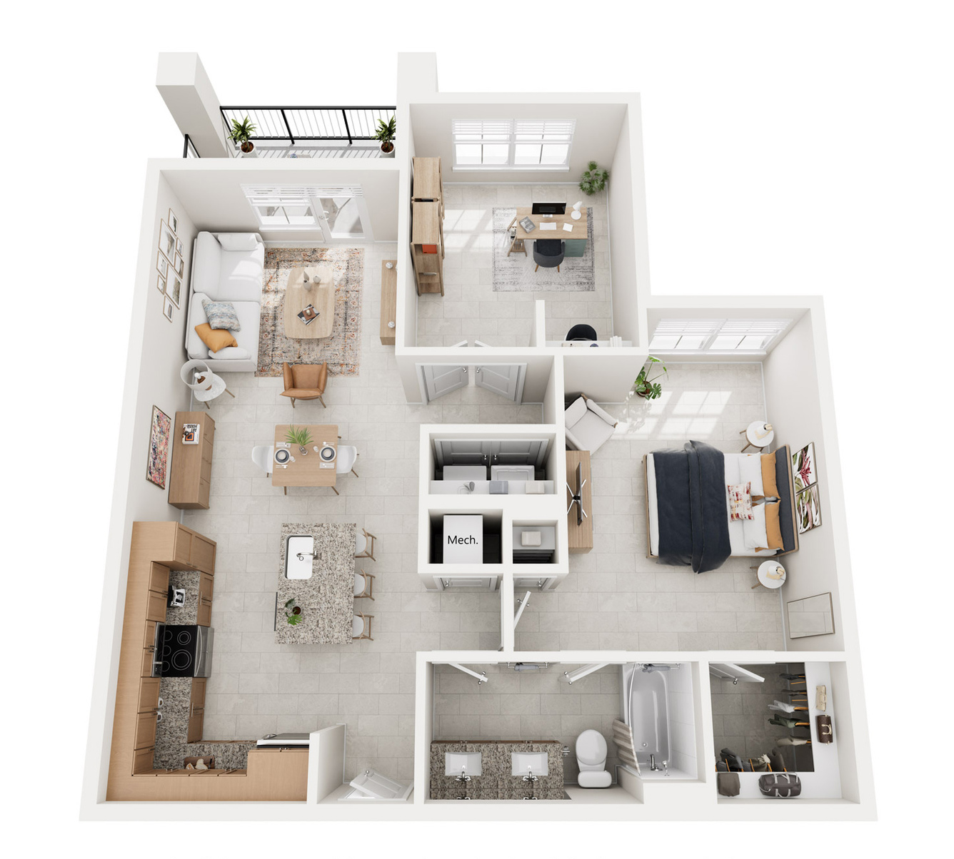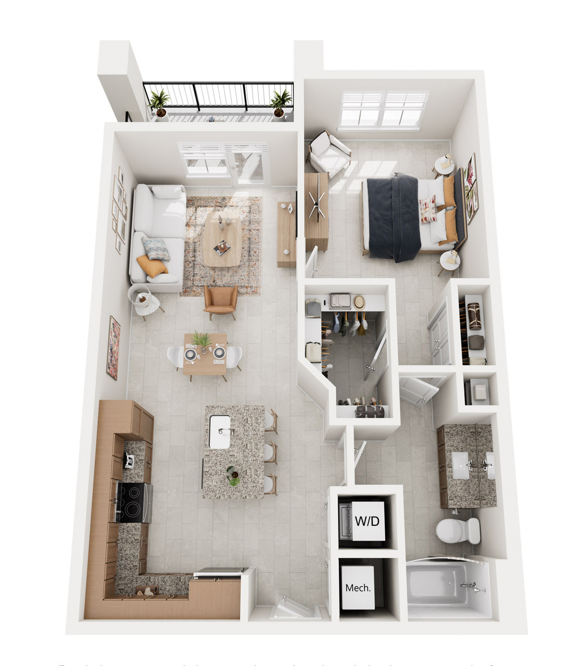 Enjoy upscale finishes in every apartment, including quartz countertops, stainless steel appliances, subway tile backsplashes, and custom shaker-style natural wood cabinetry. Textured Stone-Look Laminate Flooring enhances the living spaces with a sleek, low-maintenance surface. Each home includes a full-size washer and dryer, digital thermostat, USB charging ports, ceiling fans in living and bedroom areas, and ample cabinet and closet storage. For added versatility, select one-bedroom floor plans include dens with built-in desks and shelving.