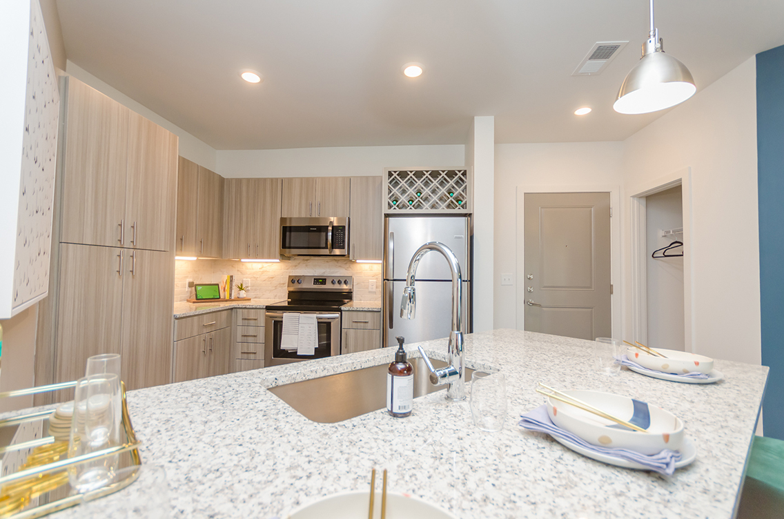 Come home to a striking one or two bedroom apartment adorned with all the luxe features you need for an elevated lifestyle. Gourmet kitchens gleam with stylish finishes, including designer tile backsplash, granite countertops, and stainless steel appliances. Beyond the kitchen, expansive living areas catch your eye with wood-finish flooring, bright accent walls, and lofty ceilings. Further simplifying your day-to-day, our pet-friendly homes offer in-home laundry appliances and the options for upgrades such as walk-in showers with rain shower heads, private patios or balconies, and large walk-in closets.