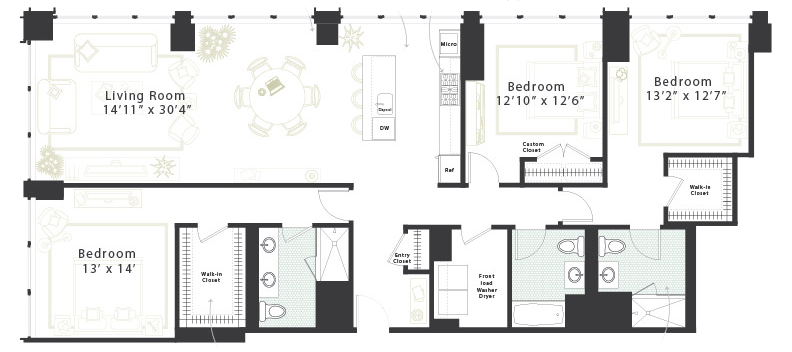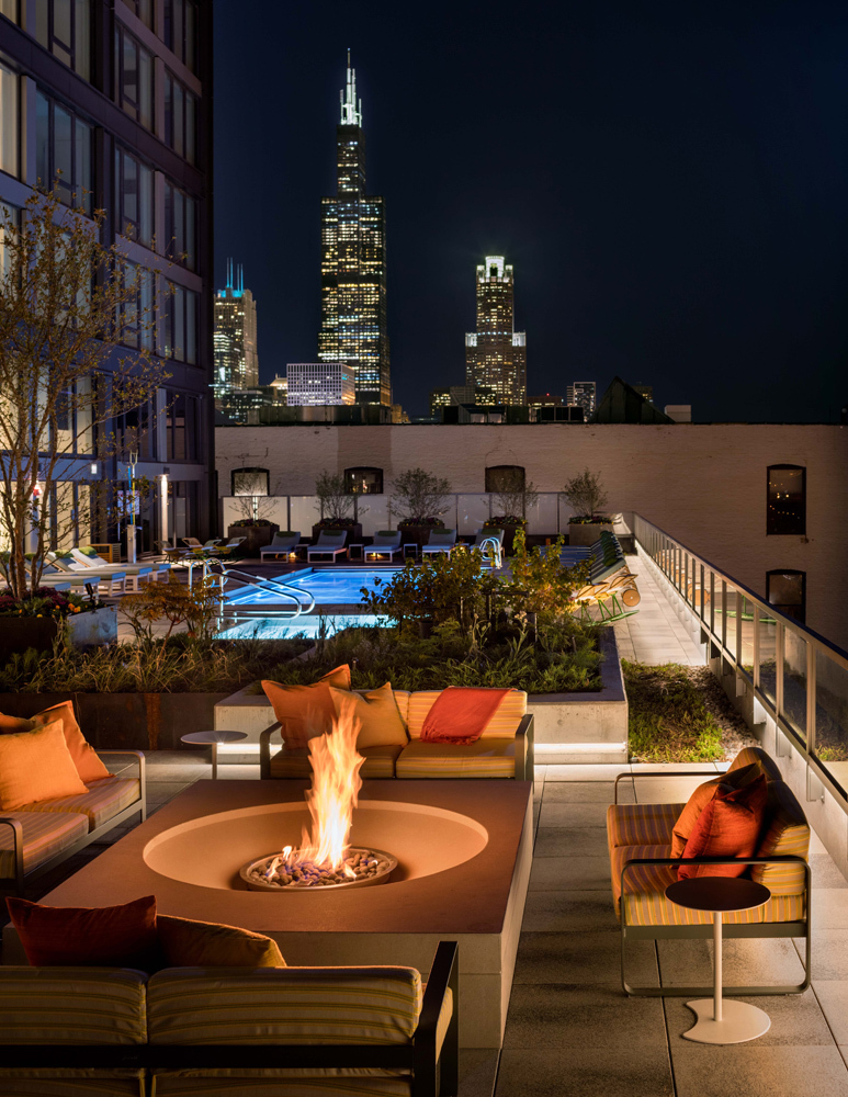 • Landscaped, rooftop sundeck with pool, cabanas, and barbecue grills