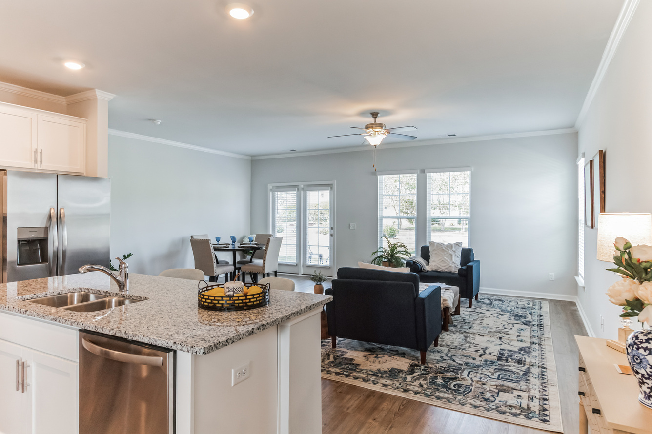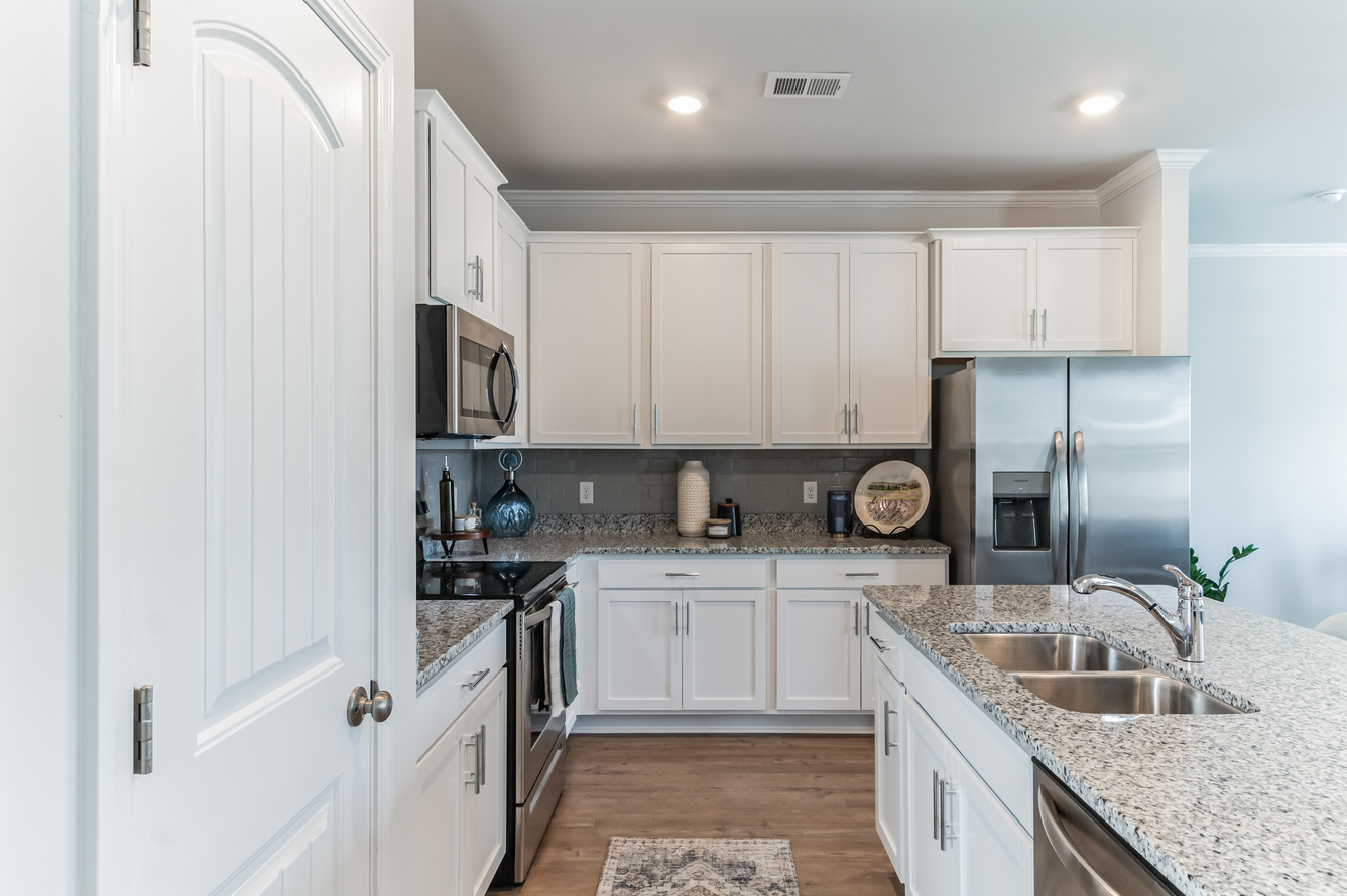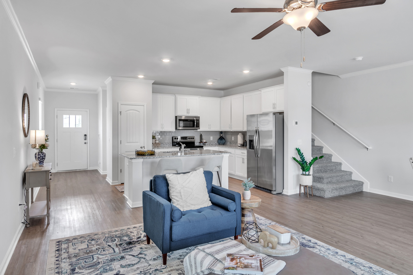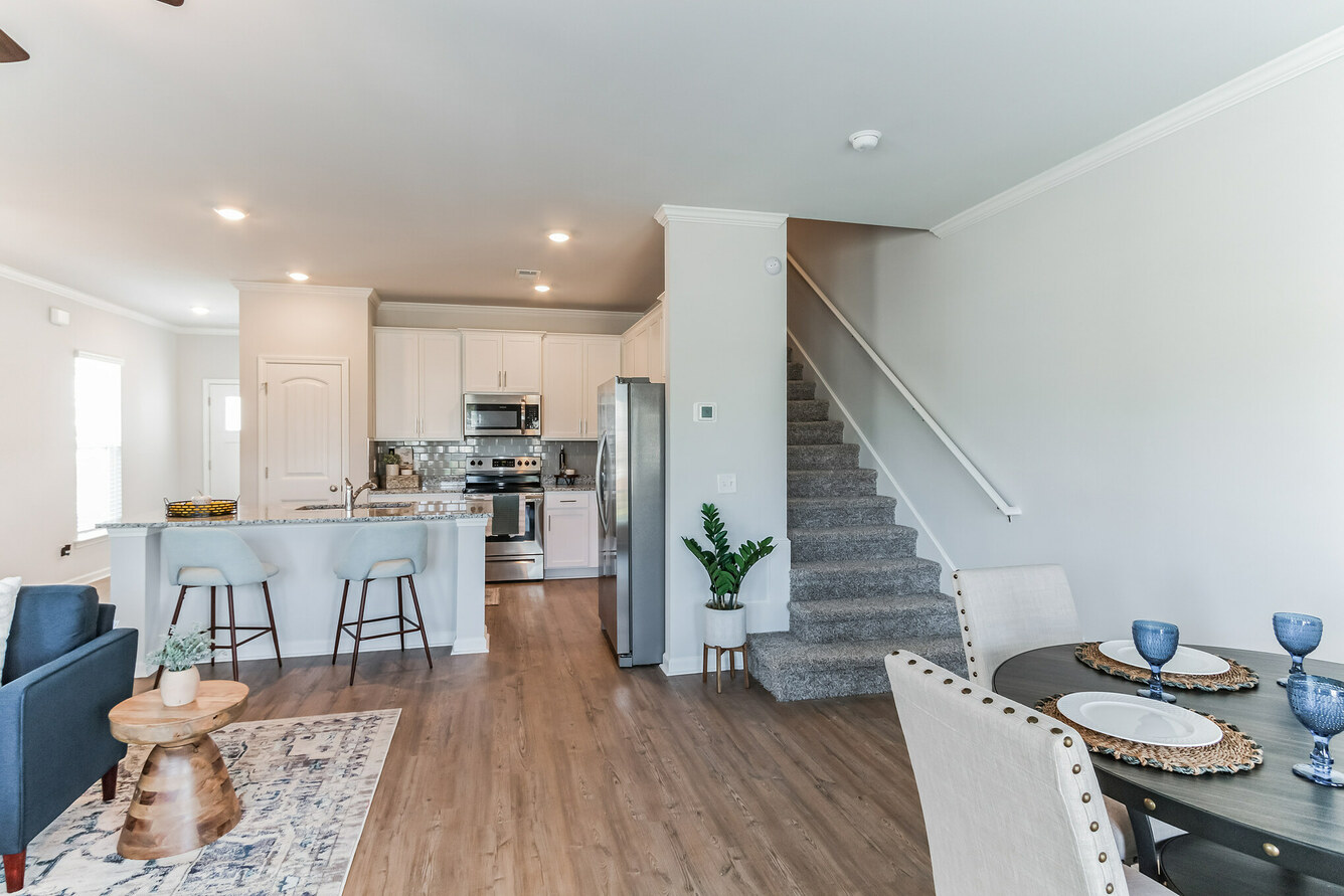 On the first floor of each home, you’ll find a fully equipped kitchen with plenty of upscale finishes, including sleek stainless steel appliances and a stylish tile backsplash. In-home washer and dryer sets allow you to do laundry in no time, while smart-home technology streamlines your other day-to-day tasks. When you need a break from your busy schedule, step outside for some fresh air on your private porch or patio. Select floor plans also feature a fenced yard for your furry friends to roam around in.