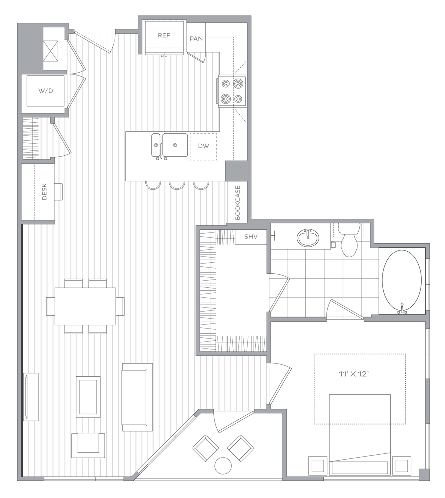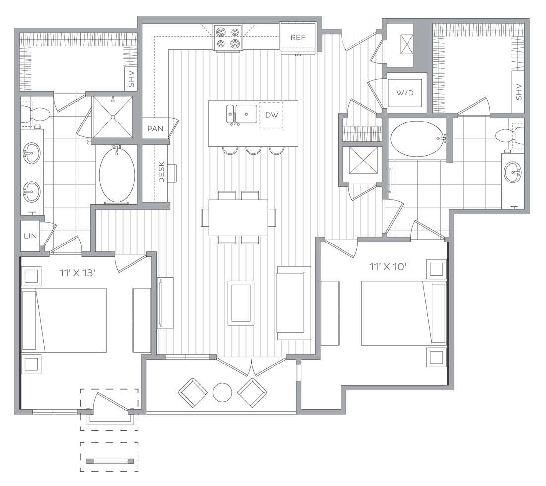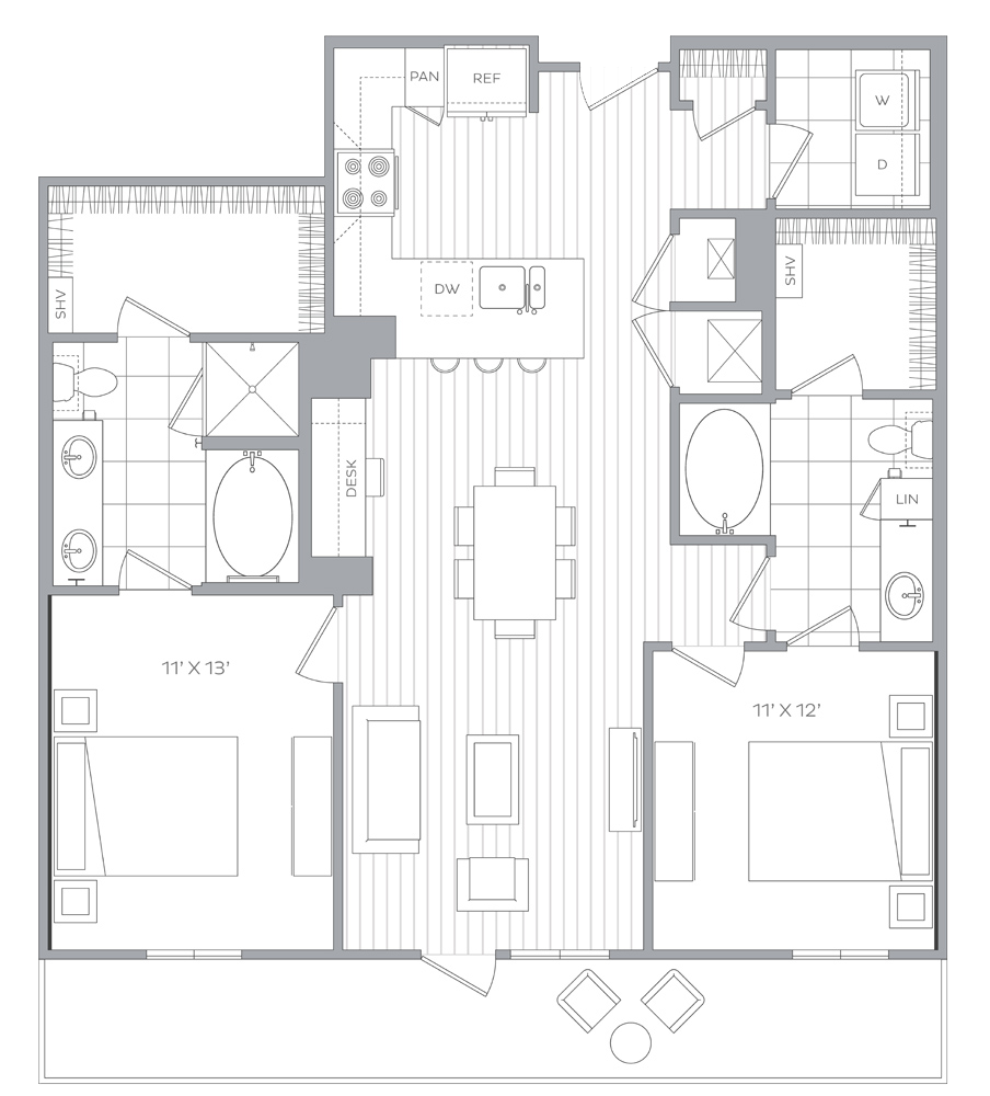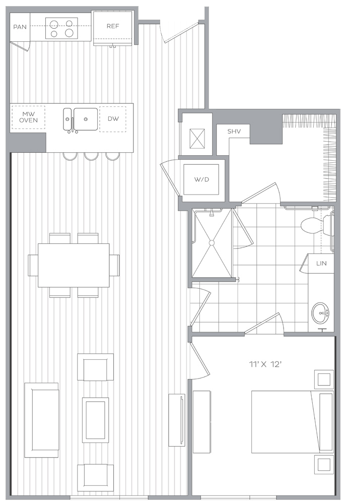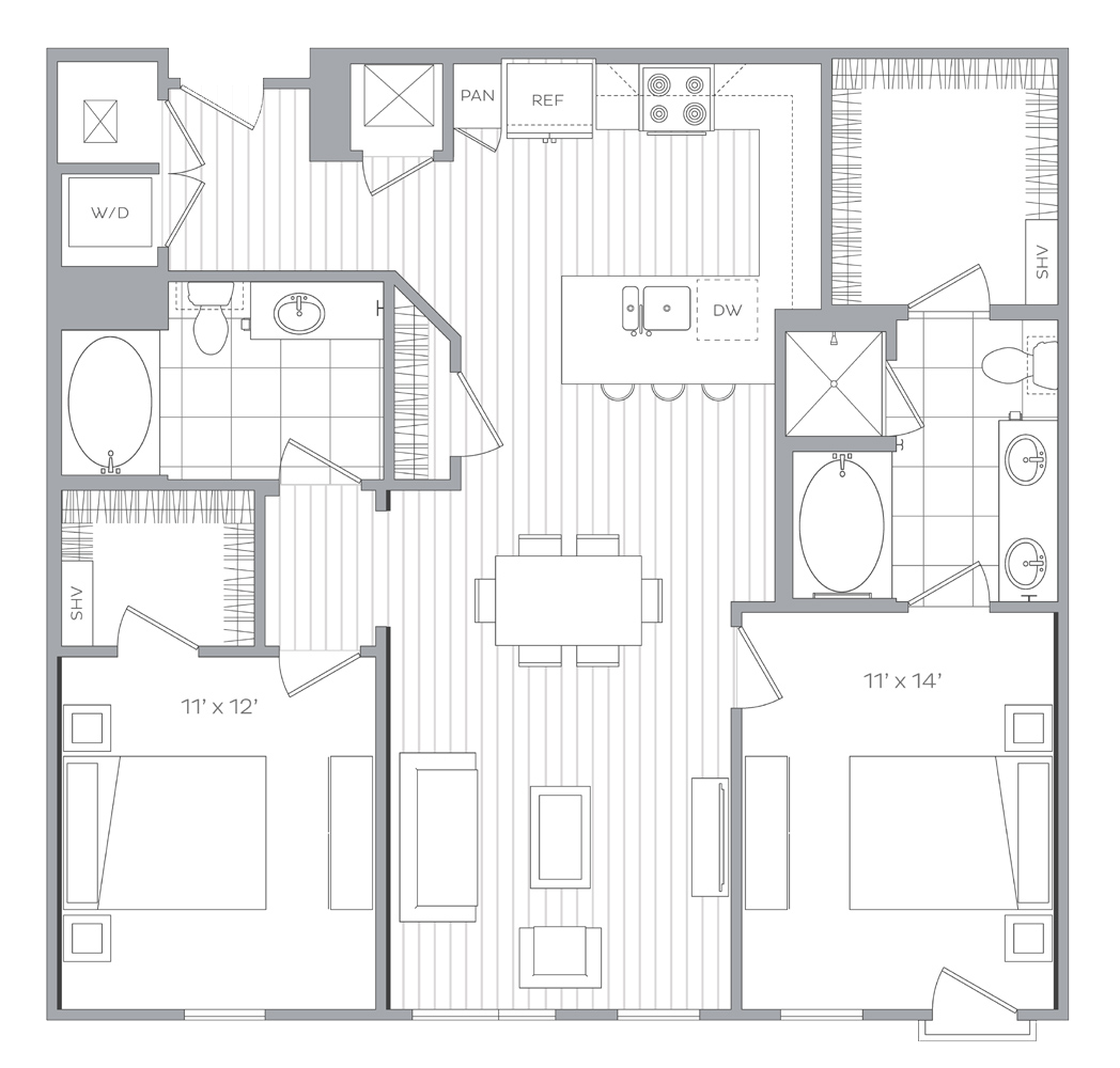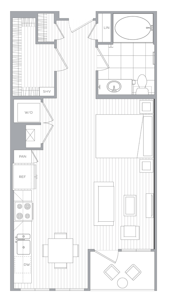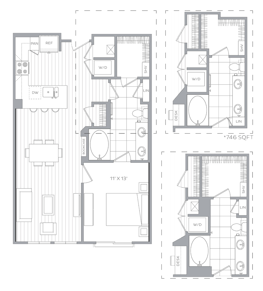 Choose from studio, one, two, or three open-concept apartments that feature premium materials and stylish finishes. Inside each home, you will find gourmet kitchens with designer cabinetry and under lighting. Additionally, beautiful stainless steel appliances will complement the granite or quartz counters and stone tile backsplashes. The rest of your apartment showcases both functional and elegant features including accent walls complementing the wood-style flooring in the living and dining areas and spacious walk-in closets. Your apartment will also include built-in bookcases, computer desks and dry bars in select apartments. For your convenience, you will also have a full-size washer and dryer.