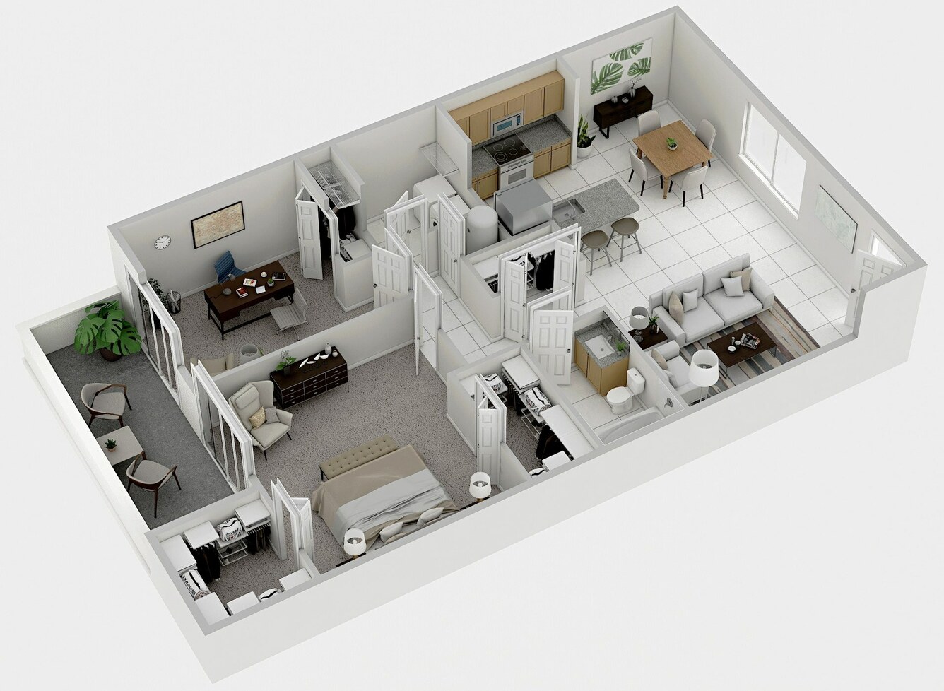 Feel right at home in any of our two-bedroom floor plans. Vibrant, spacious interiors with tile flooring and bright neutrals create elegant canvases for you to personalize. Plush carpeting in bedrooms adds style and comfort. Find cooking a delight in a stunning kitchen with granite countertops, black appliances, and maple wood cabinets. A breakfast bar offers you a cozy spot to savor your meals. Enjoy a spa-style treatment at home thanks to stylish bathrooms with garden tubs or walk-in showers, white cabinets, and upgraded fixtures. Roomy closets are available, too.