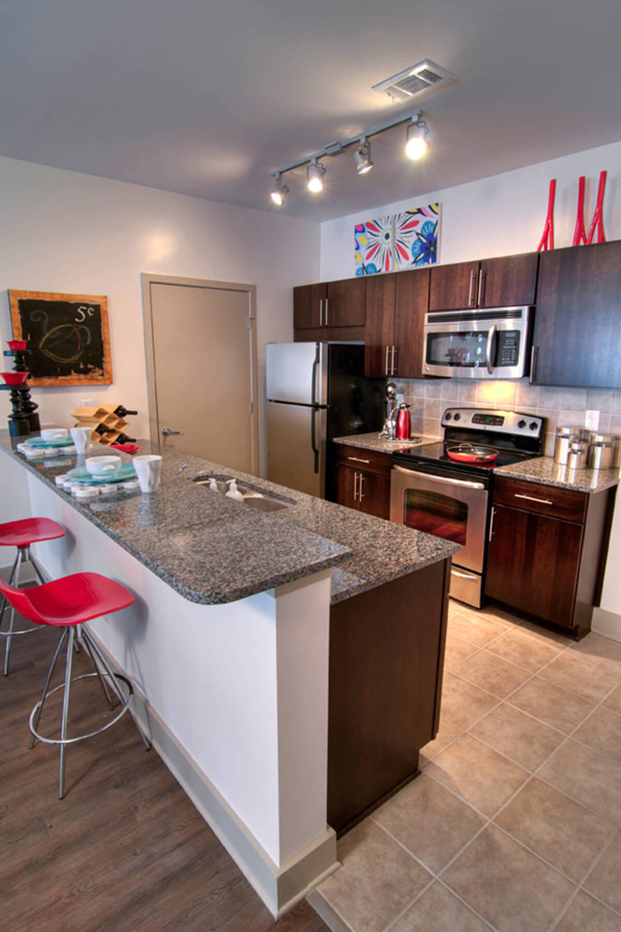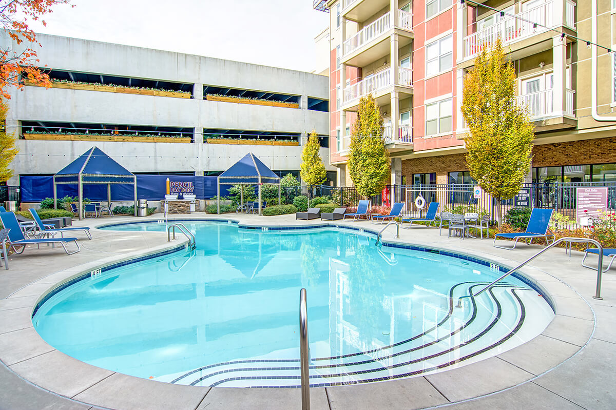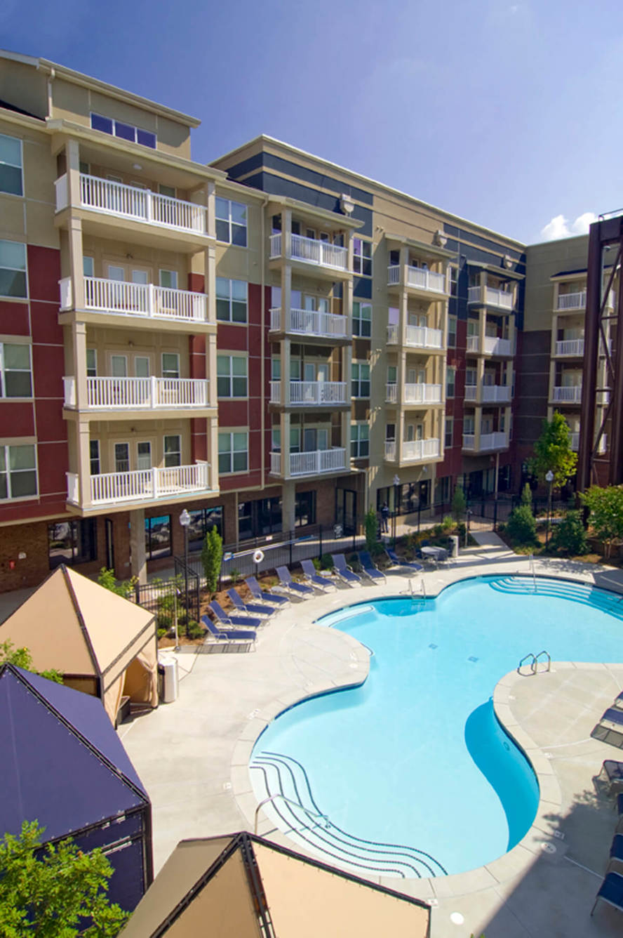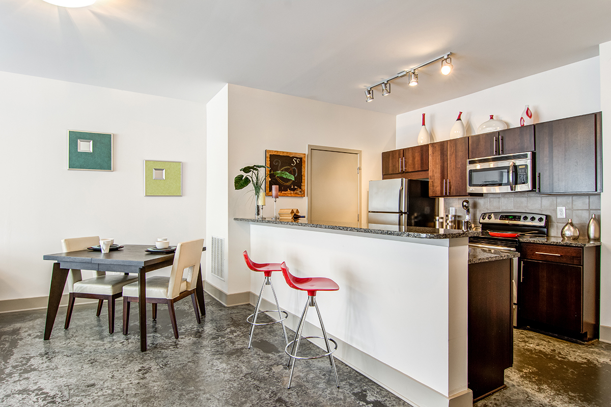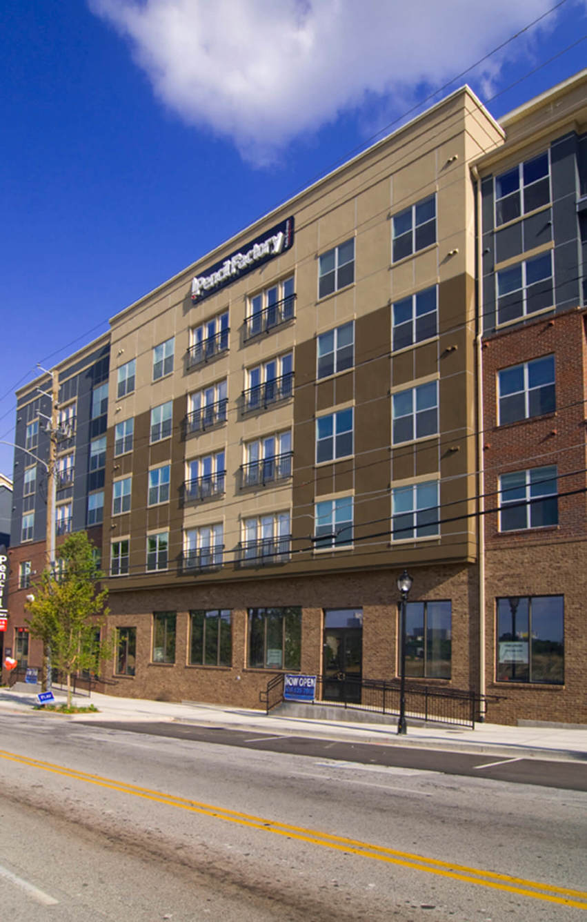 At Pencil Factory Flats, we not only offer studio, one-, and two-bedroom lofts smack dab in downtown Atlanta, GA, but also strive to cultivate a powerful sense of community for all our residents. Right off the bat, we offer a staggering 30 different floor plans that range in layout and amenities, all to give you maximum freedom to find the best apartment for your particular vision of home. Our homes provide ample space in every room, with 9 to 20-foot vaulted ceilings depending on your floor plan. Kitchens boast stainless steel appliances, granite countertops, and mahogany wood cabinetry that complements the hardwood floors, while bathrooms have separate showers and optional garden bathtubs. We especially recommend our homes with washers and dryers included, and floor plans with large patios or Juliet balconies so you can enjoy the much-envied city view they provide. However, community is about more than just your own home. Pencil Factory Flats curates a warm community atmosphere with the common spaces our residents share, like the social courtyard with grilling stations and gorgeous fountains, the resort style pool with outdoor relaxation cabanas, and our very own cardio gym. Meet your neighbors as you both enjoy the dramatic views of downtown and midtown Atlanta accessible from our space, or invite guests who can make ready use of our parking deck and proximity to I-75/85 and I-20, connecting the city to us and us to all of Atlanta and beyond. In addition to our physical nearness to downtown’s numerous museums, restaurants, Zoo Atlanta, Georgia Aquarium, and more, we also have incredible connection in the cyber sense. As a Google Fiber community, meaning our shared wireless internet speeds are impressive, to say the least. Stop by for a tour to feel this amazing community atmosphere for yourself!