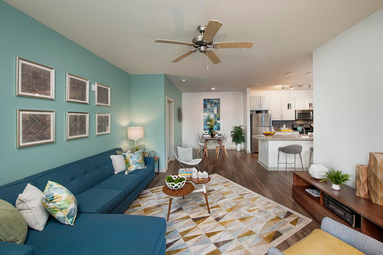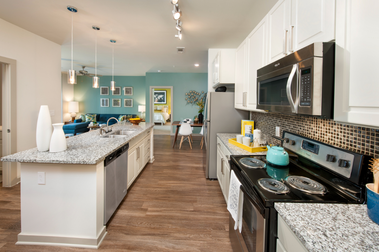 Our six floor plans, ranging between one and three bedrooms, come in your choice of two designer finishes. Select a gourmet kitchen with cloud white granite countertops and pacific grey cabinets or opt for harbor white granite countertops with olivewood cabinetry. Every kitchen also comes with opulent kitchen backsplashes, stainless steel appliances, and USB charging outlets. Vinyl plank flooring flows throughout expansive living areas pre-wired for intrusion alarm systems and light-speed internet with Gigabit connections. Standing showers and private balconies with expansive views are available in select homes.