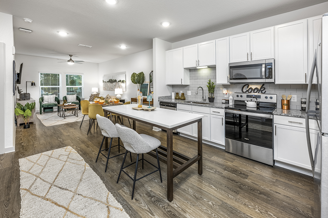 Relax and take in all the comforts of home in your stylish new apartment at Residences at Markets West, an amenity-rich, pet-friendly community in Gainesville, FL. Choose from one-, two-, and three-bedroom floor plans and surround yourself with some of the best perks of apartment living. Contemporary vinyl plank flooring guides you from room to room, introducing you to beautifully designed living spaces, including a chef’s kitchen with upscale cabinetry and granite countertops, a luxurious bathroom with a garden tub, and a welcoming living room that’s fit for entertaining. Lofty nine-foot ceilings with recessed lighting give your home an open look and feel, while screened-in porches give you even more options to lounge and relax.