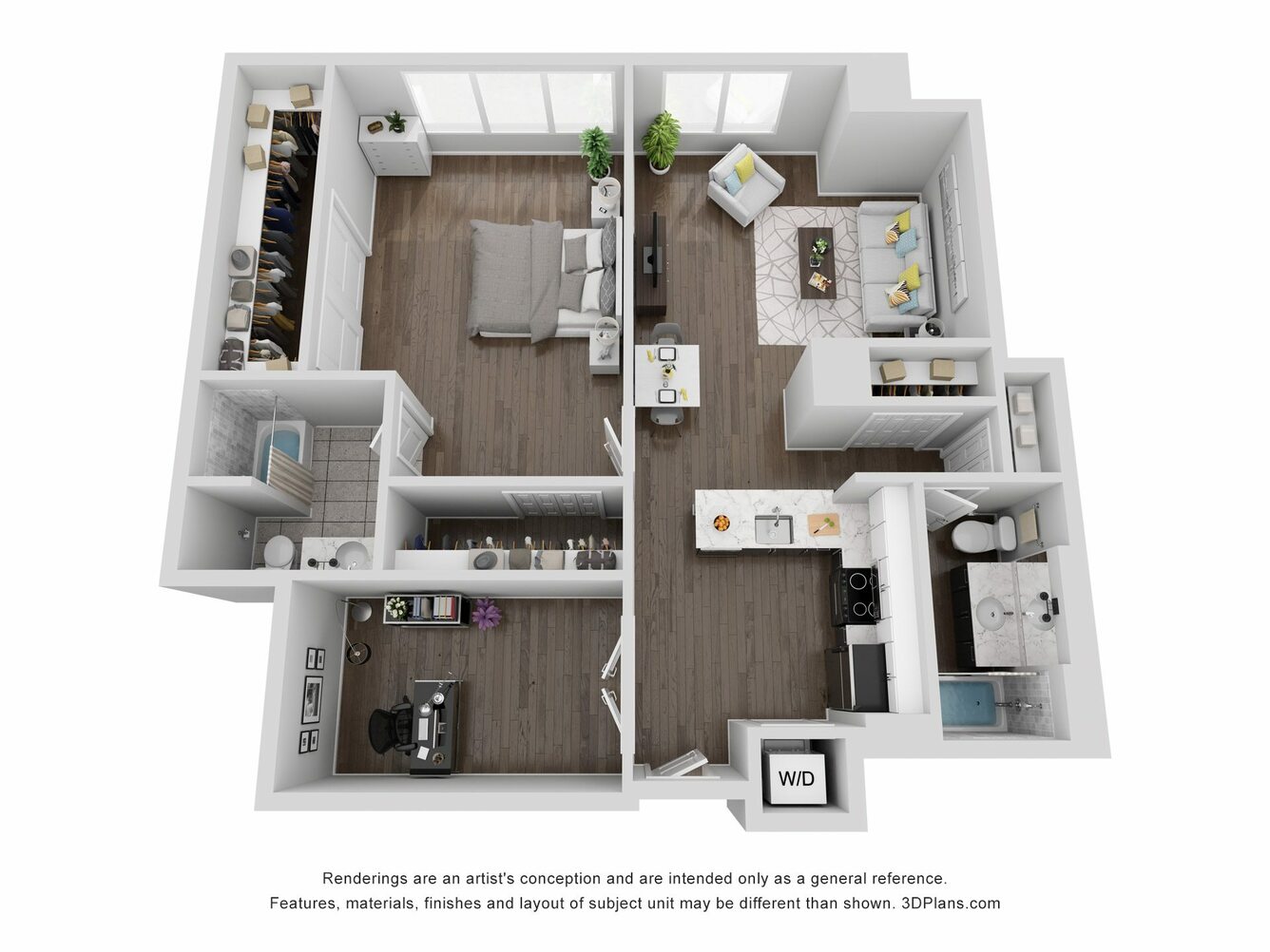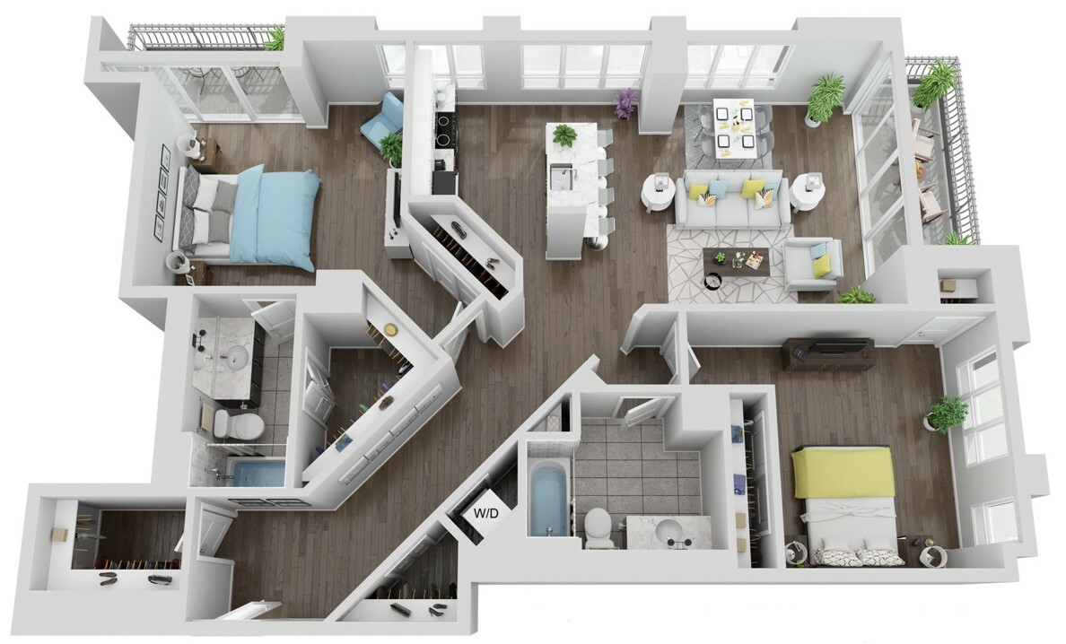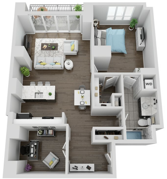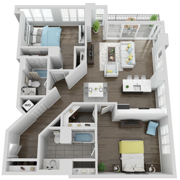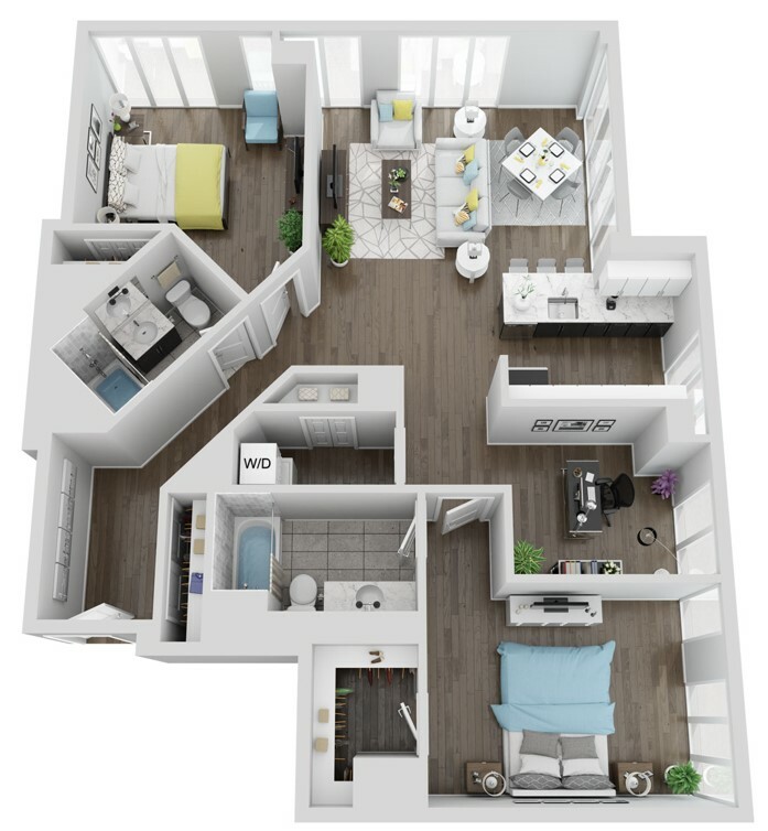 Boasting sparkling white quartz countertops, 42” espresso cabinets, and a distinctive glass tile backsplash, the gourmet kitchen is a chef’s dream come true. Get ready for the day in a spa-inspired bathroom with elegant tile. Each floor plan comes equipped with in-home laundry appliances while select layouts include expansive private terraces or balconies.
