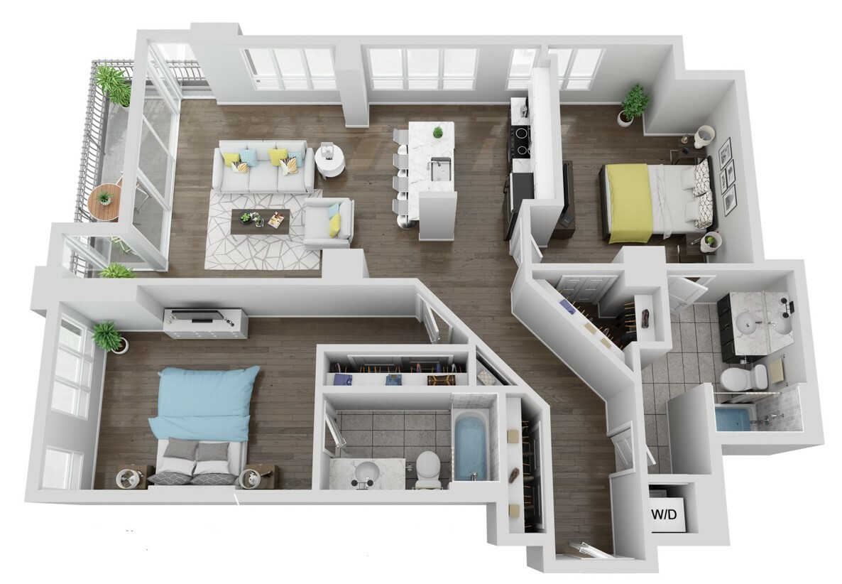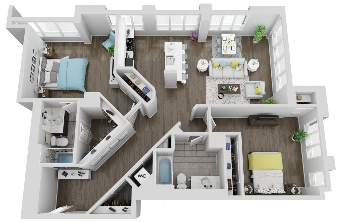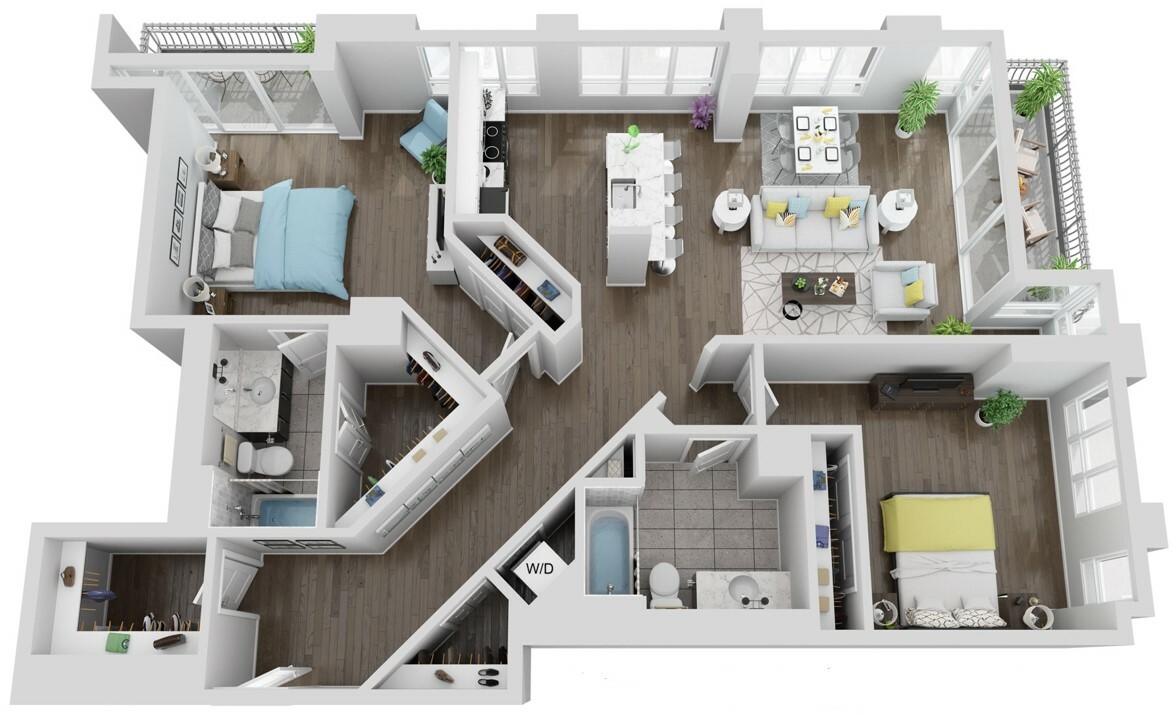 Boasting sparkling white quartz countertops, 42” espresso cabinets, and a distinctive glass tile backsplash, the gourmet kitchen is a chef’s dream come true. Get ready for the day in a spa-inspired bathroom with elegant tile. Each floor plan comes equipped with in-home laundry appliances while select layouts include expansive private terraces or balconies.