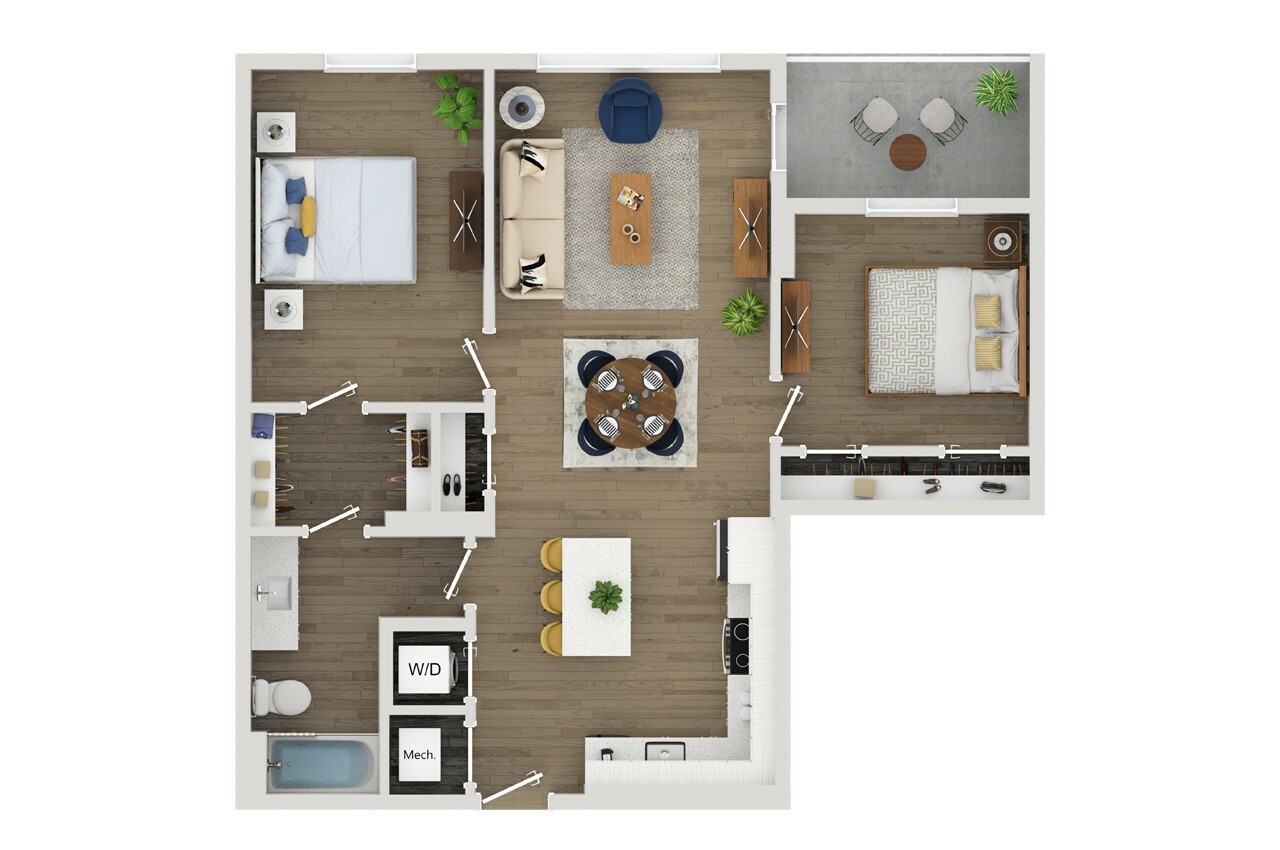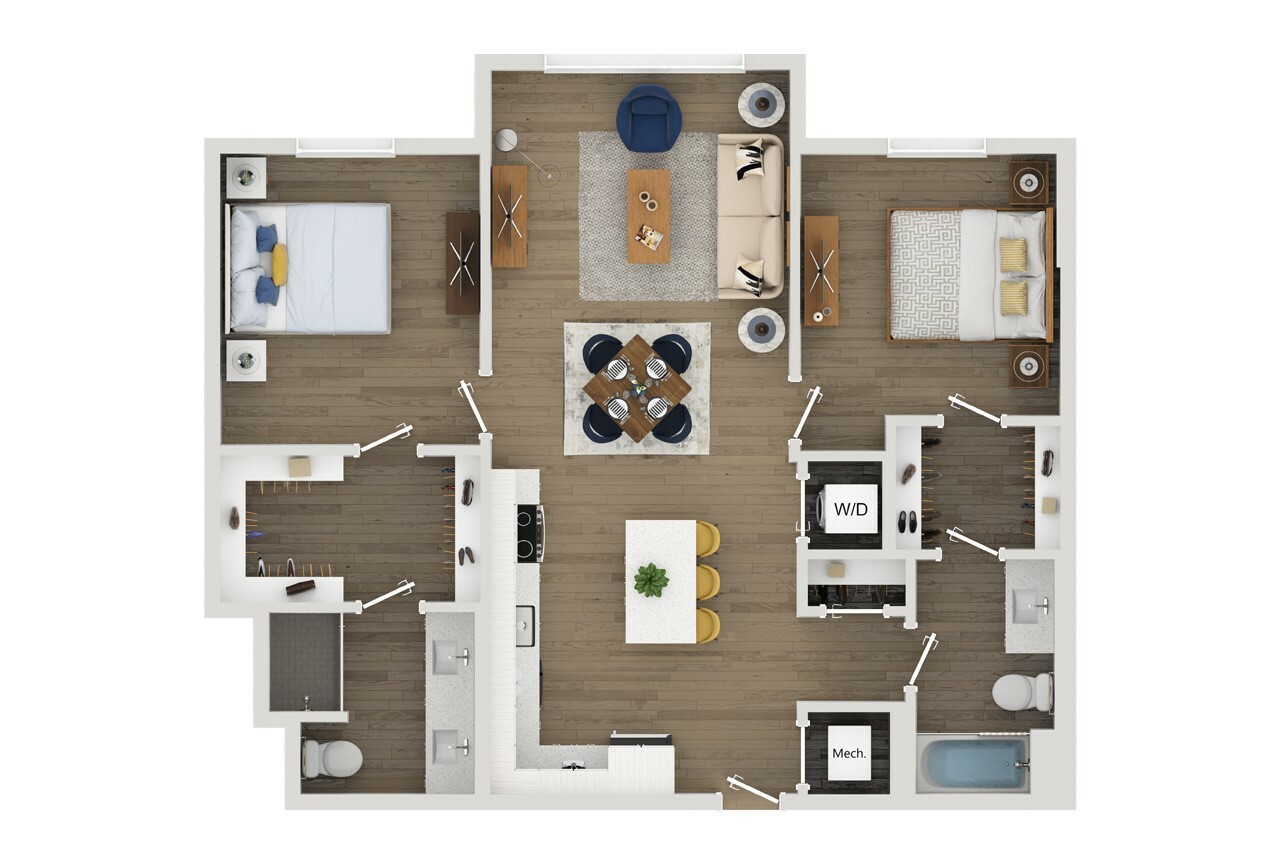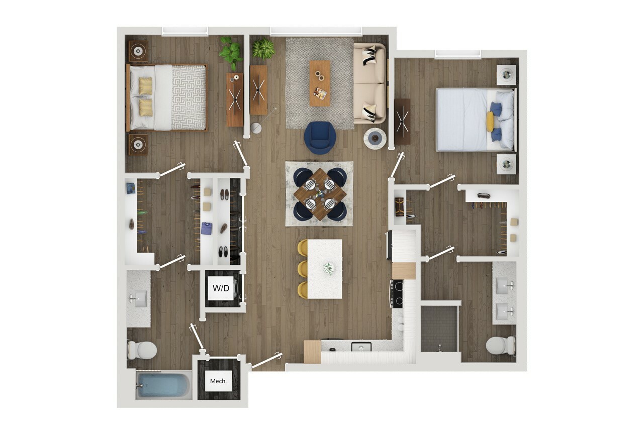 Inside, rich hardwood floors add a touch of timeless style while smart-home features and full-size laundry appliances provide plenty of modern convenience. Featuring stainless steel appliances, quartz countertops, and European-style cabinets, your contemporary kitchen sets the stage for an elevated cooking experience. Located in each bedroom, expansive walk-in closets make it easy to keep your items organized.