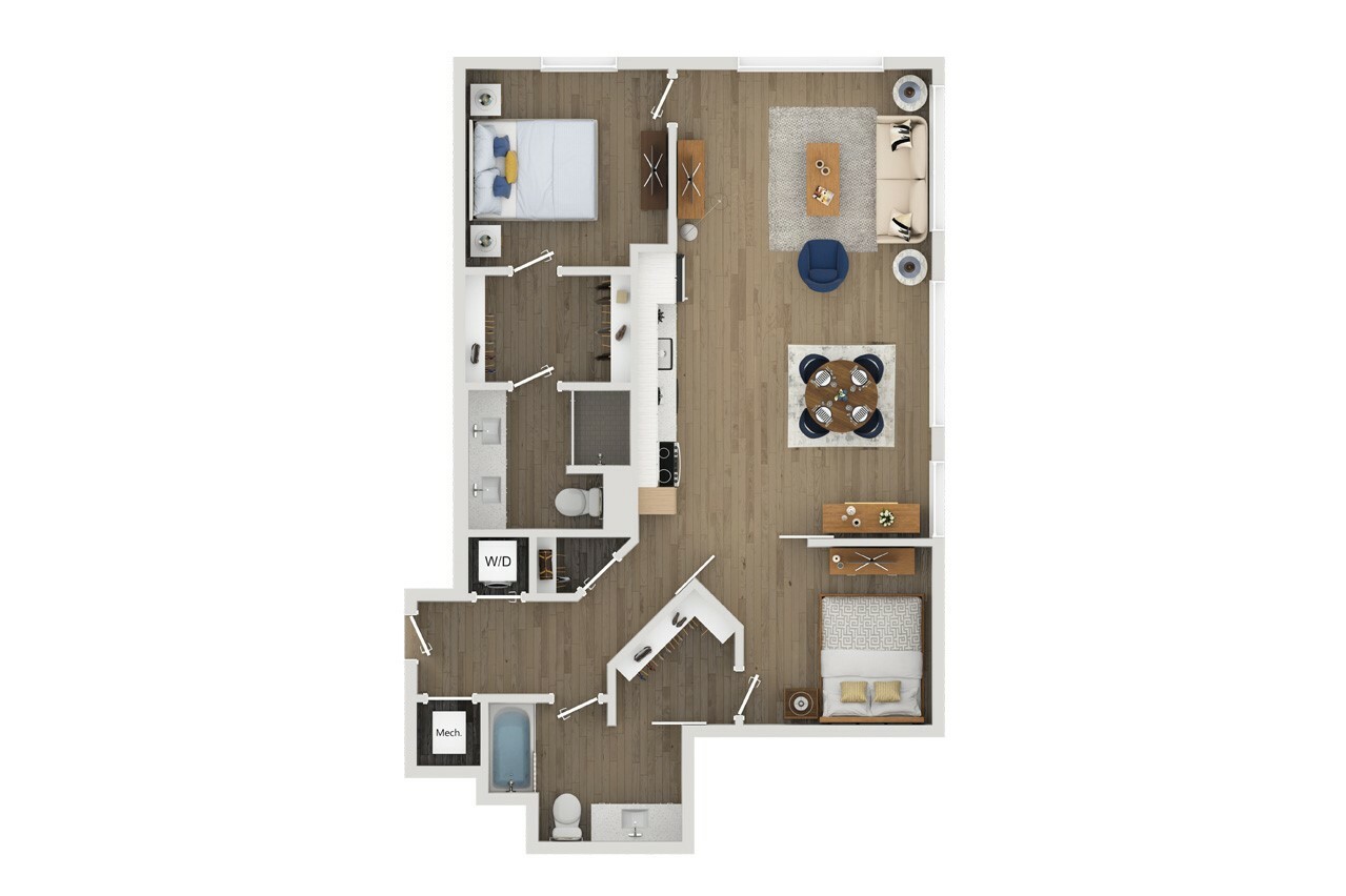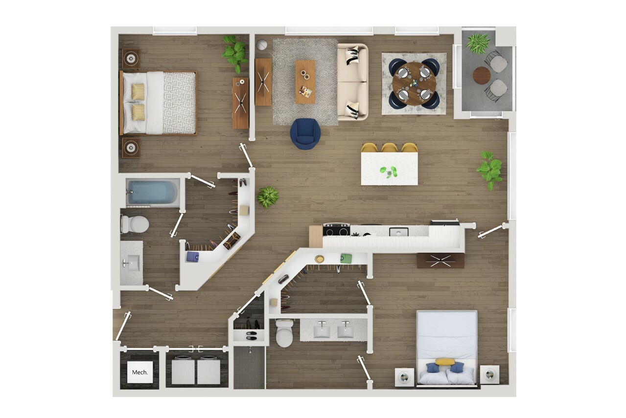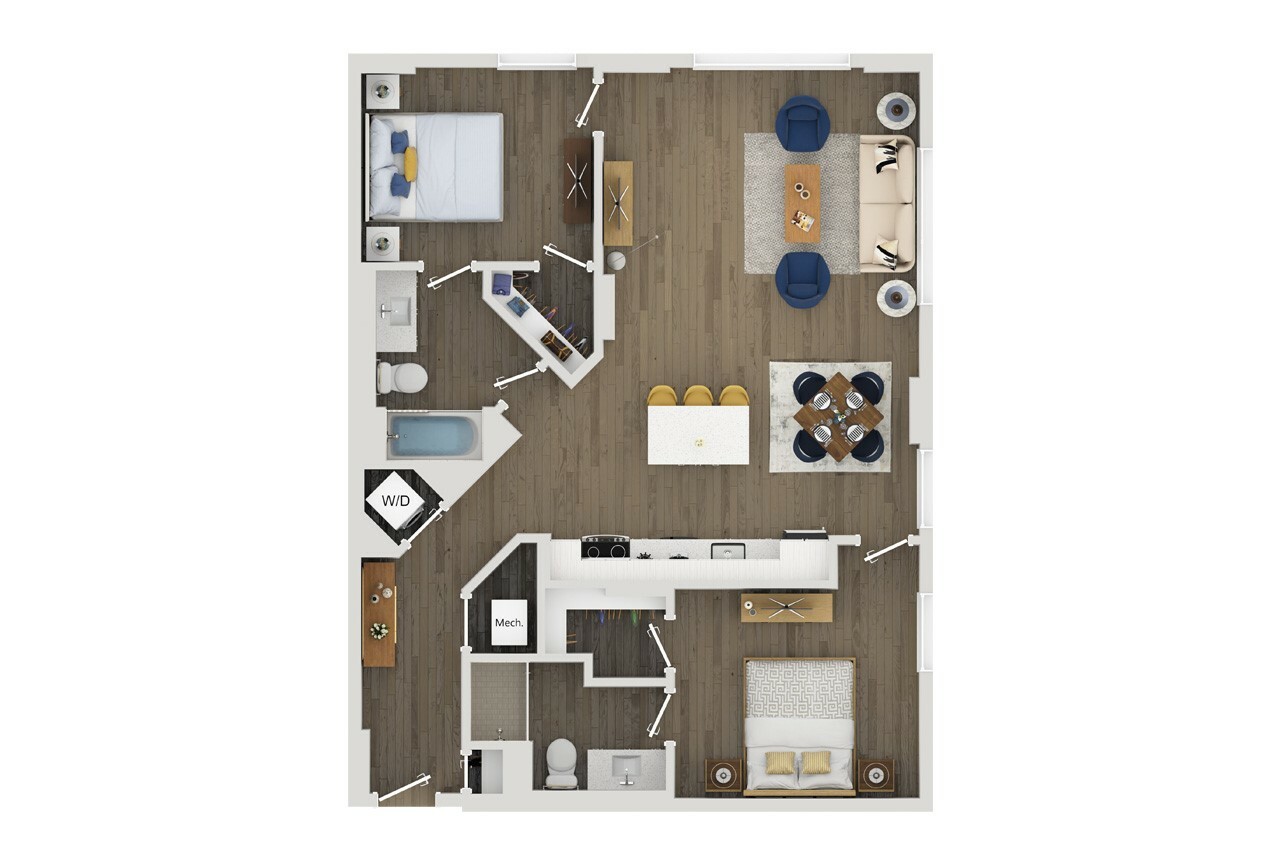Inside, rich hardwood floors add a touch of timeless style while smart-home features and full-size laundry appliances provide plenty of modern convenience. Featuring stainless steel appliances, quartz countertops, and European-style cabinets, your contemporary kitchen sets the stage for an elevated cooking experience. Located in each bedroom, expansive walk-in closets make it easy to keep your items organized.