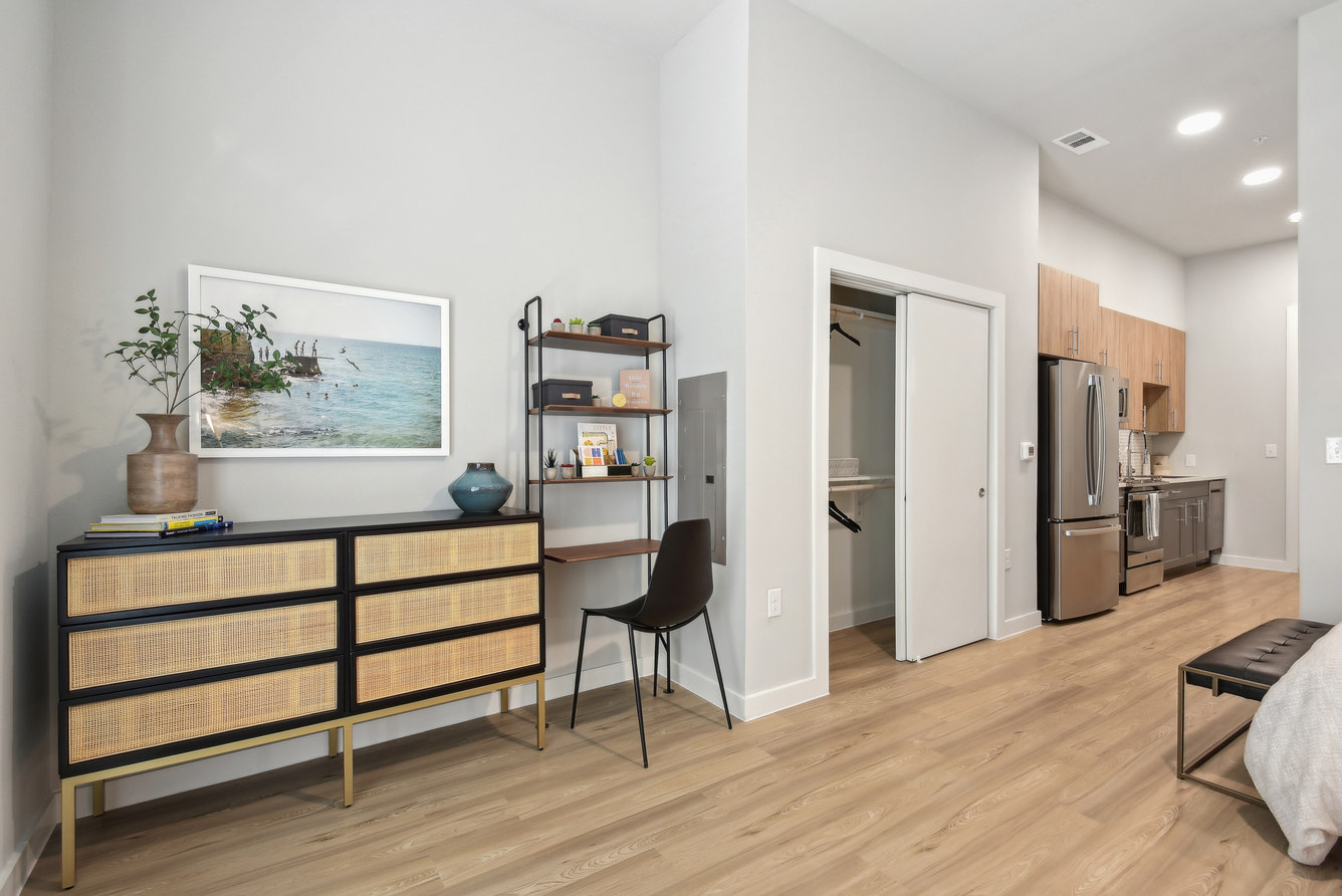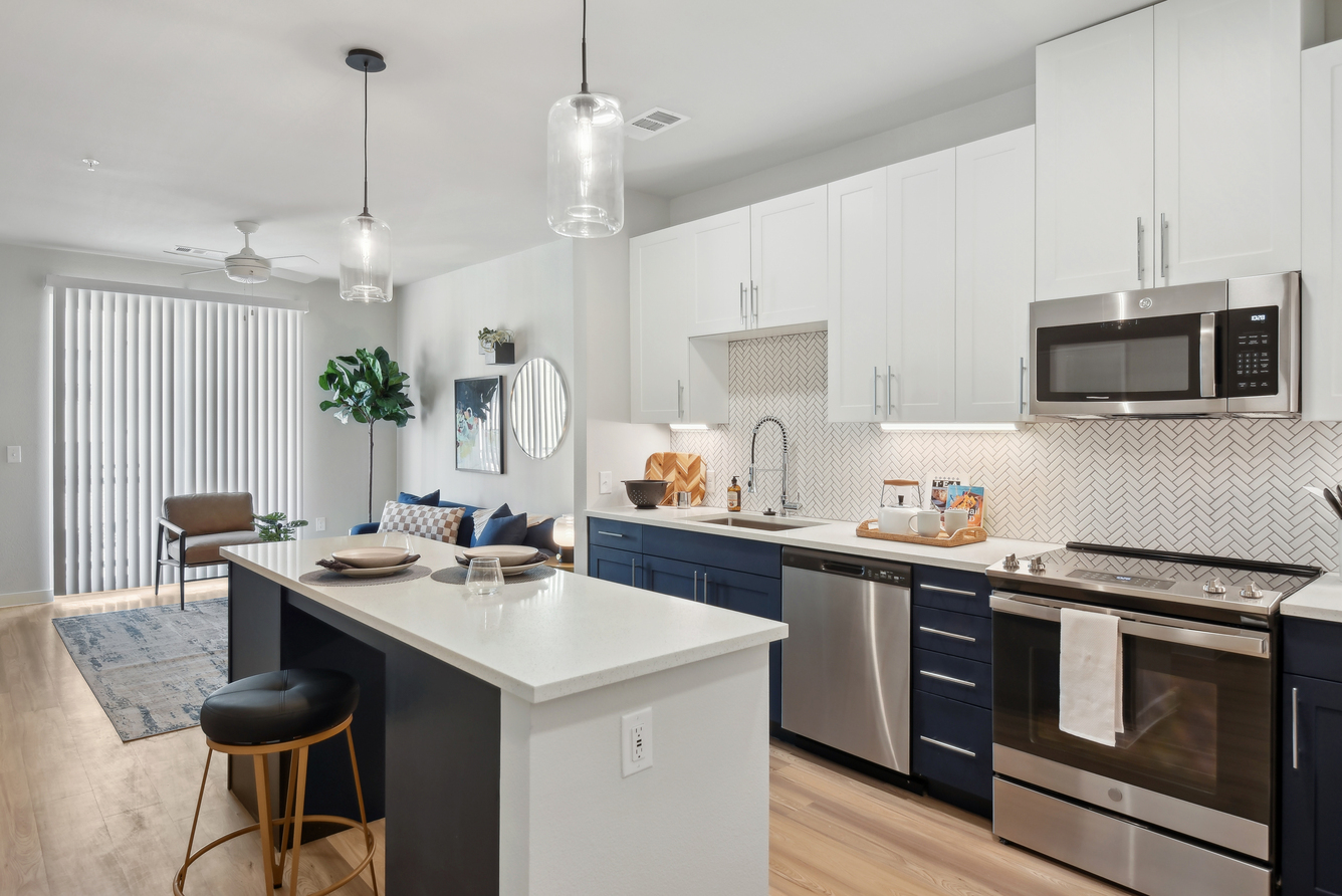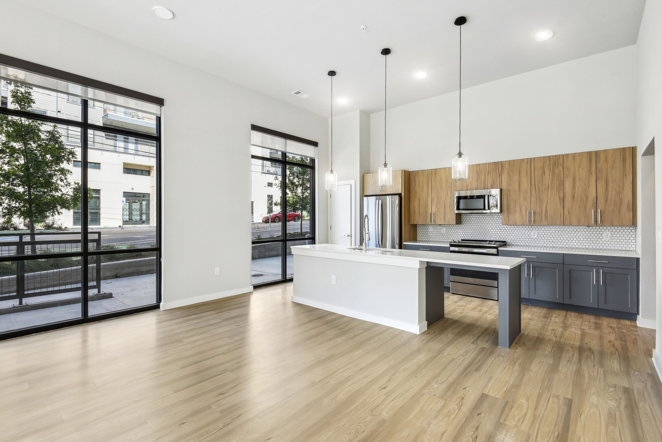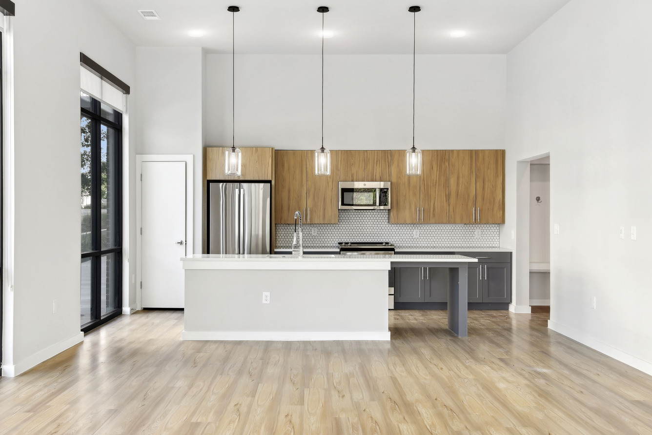 As soon as you step inside, features like lofty ceilings and sleek wood-style flooring invite you to feel at home. A modern kitchen with stainless-steel appliances and custom two-toned cabinets makes it easy to master your culinary skills, while generously sized walk-in closets with built-in shelving take organization to the next level. If you work remotely, our two-story live/work loft layouts allow you to achieve ultimate productivity at home.