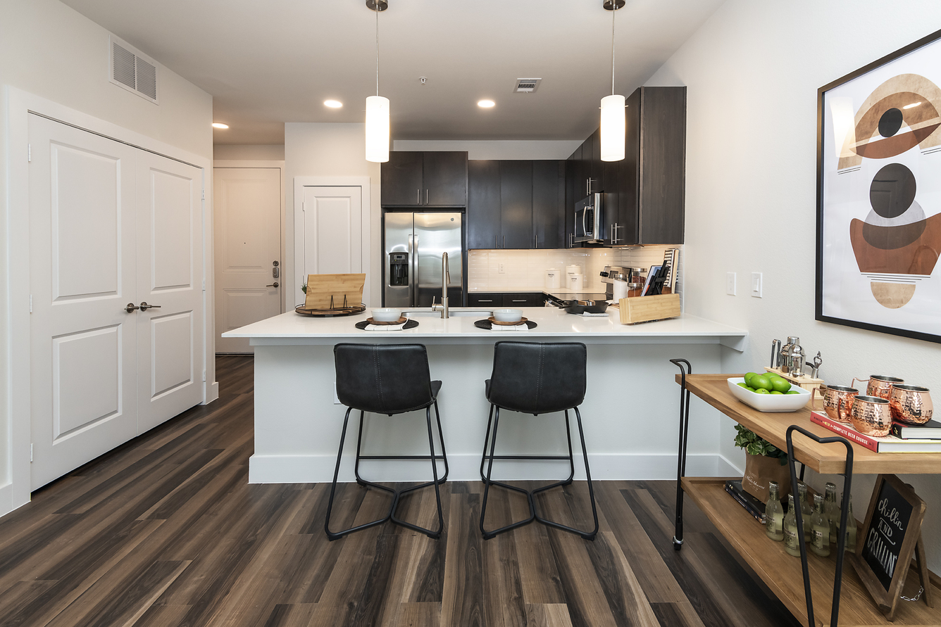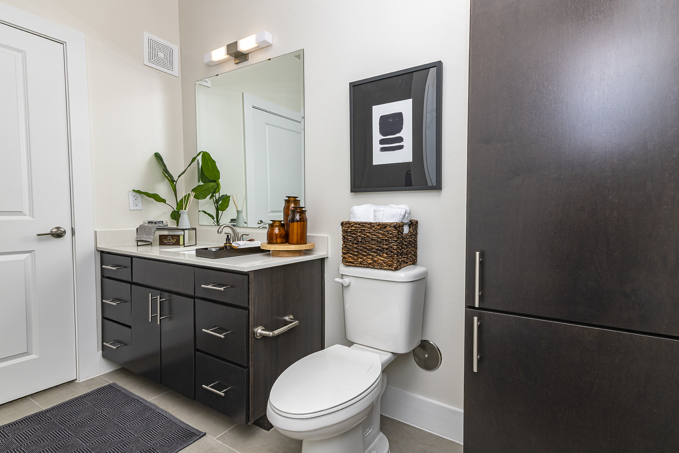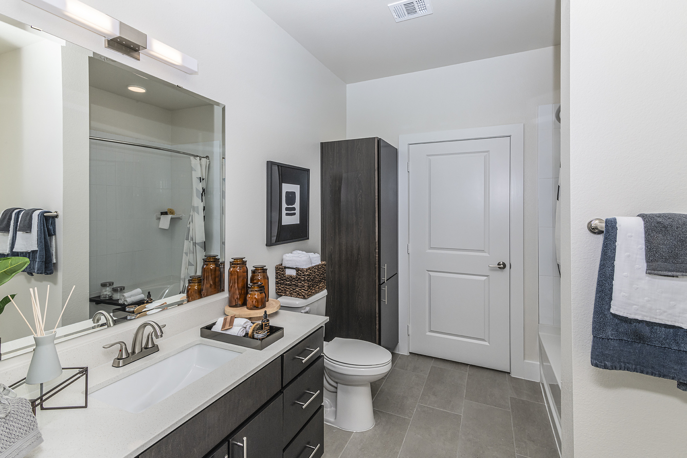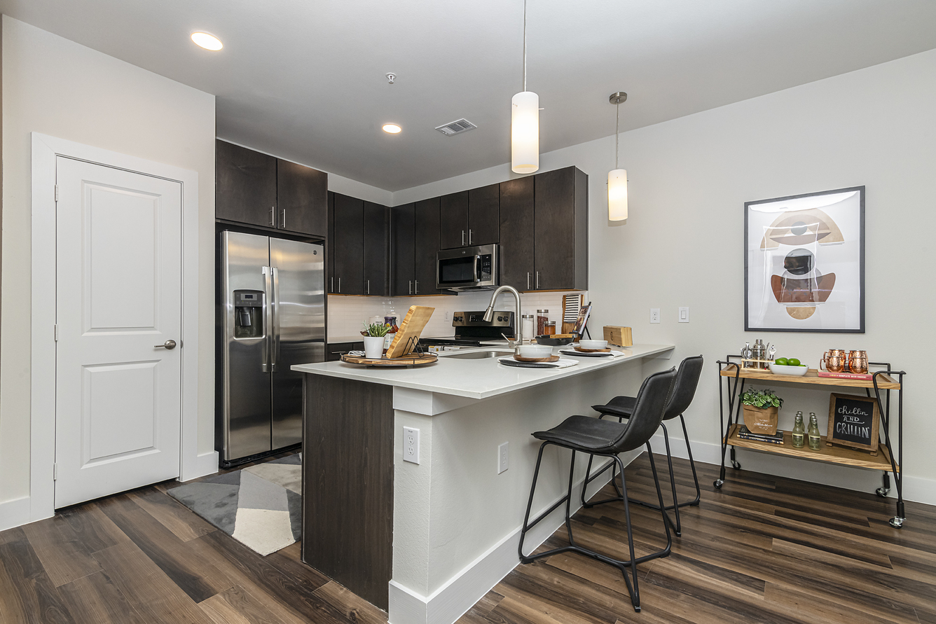 Come home to a one, two, or three-bedroom apartment with nine-foot ceilings, designer lighting, and wood-look flooring. Energy-efficient windows and a SMART thermostat keep your entire home comfortable. Emulate your favorite chef in a gourmet kitchen with an island and quartz countertops. You can cook in style using the ceramic glass cooktop range and Energy Star-certified stainless steel appliances. A spacious pantry, elegant cabinetry, and wine rack offer abundant storage. Beautiful ceramic tiles line your bathroom floor and surround your garden tub. Dual vanities and glass-enclosed showers are available in select homes. For added comfort, each apartment has a patio or balcony. You’ll enjoy the convenience of a custom walk-in closet and an in-home washer and dryer set.