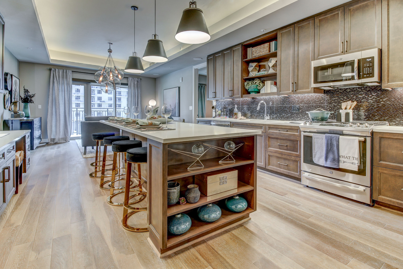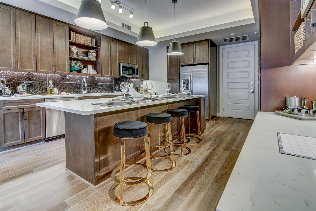 The Christopher offers luxurious studio, one-, two-, and three-bedroom floor plans, including penthouses. With a variety of unique layouts, you'll uncover the ideal fit for your lifestyle. Inside our apartment homes, you will be greeted with bountiful amenities to enhance your lifestyle including custom cabinetry, gourmet islands, and a wine fridge. Wood panel style flooring is found throughout our apartments, and inside our gorgeous bathrooms, you will find upgraded tile flooring. The Christopher features amenities not only within our breathtaking apartments but throughout our modern community. Enjoy lounging poolside in a private cabana or take a dip in our resort-style pool. Looking to unwind after a long day? Head to our 8th-floor, resident-only bar and enjoy your favorite drink while lounging and catching up with neighbors. Our community also features a coffee bar and a fitness studio featuring spin bikes.