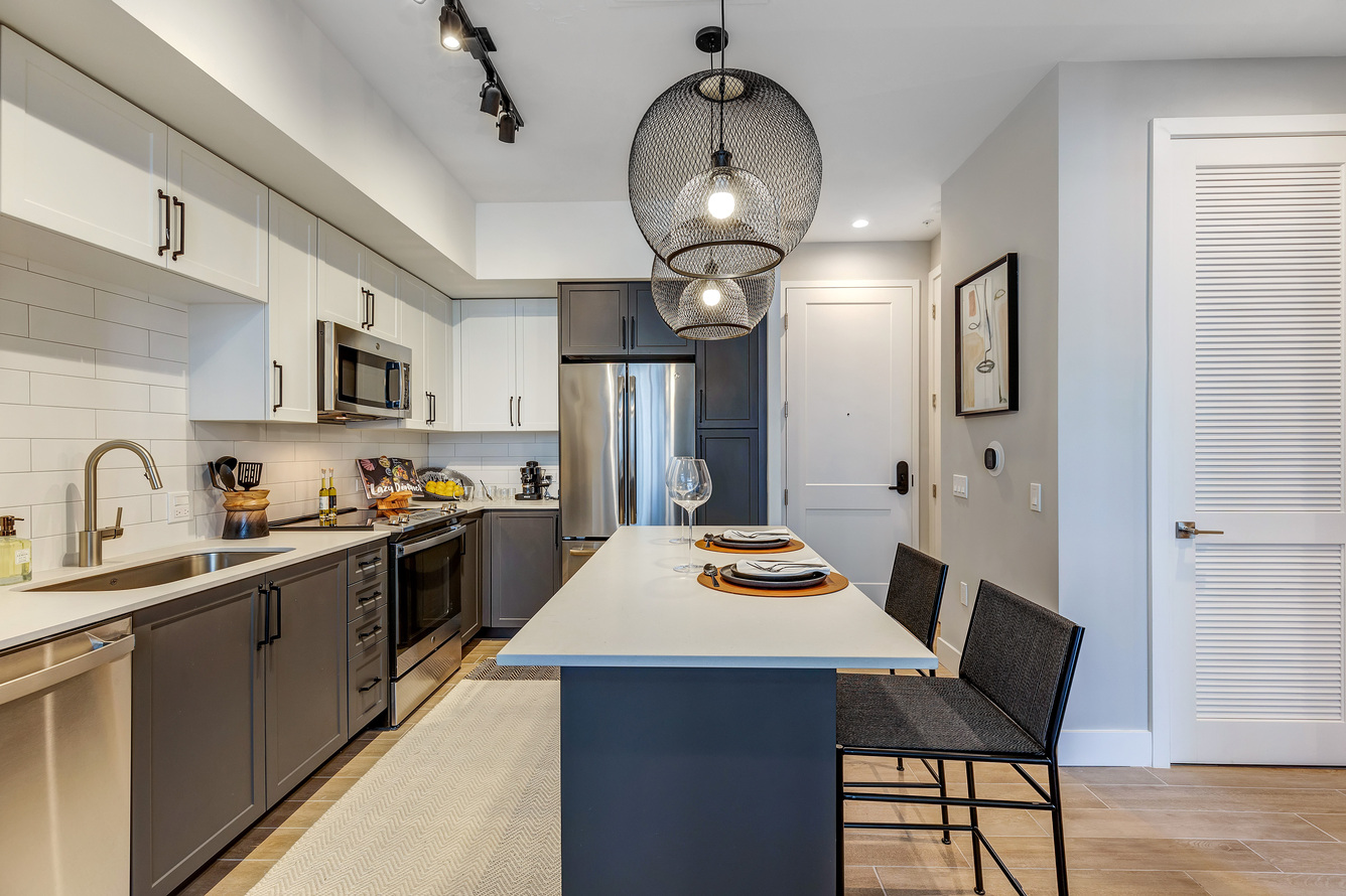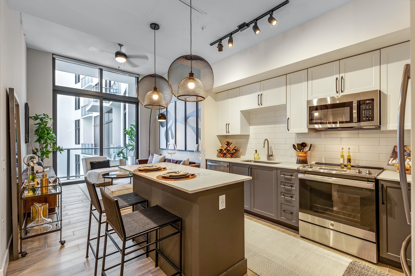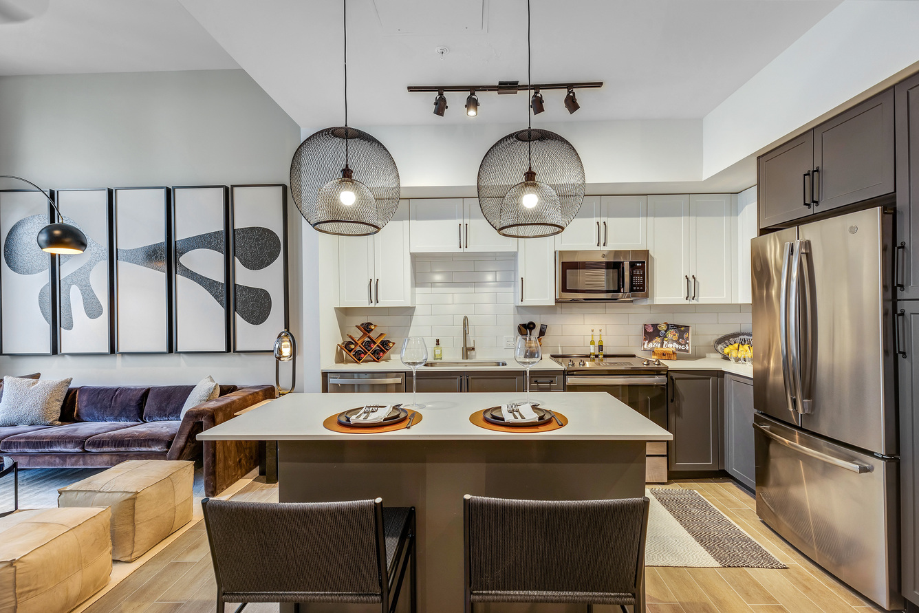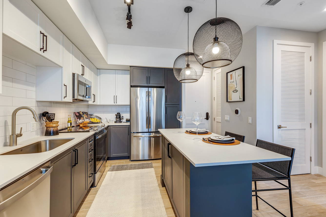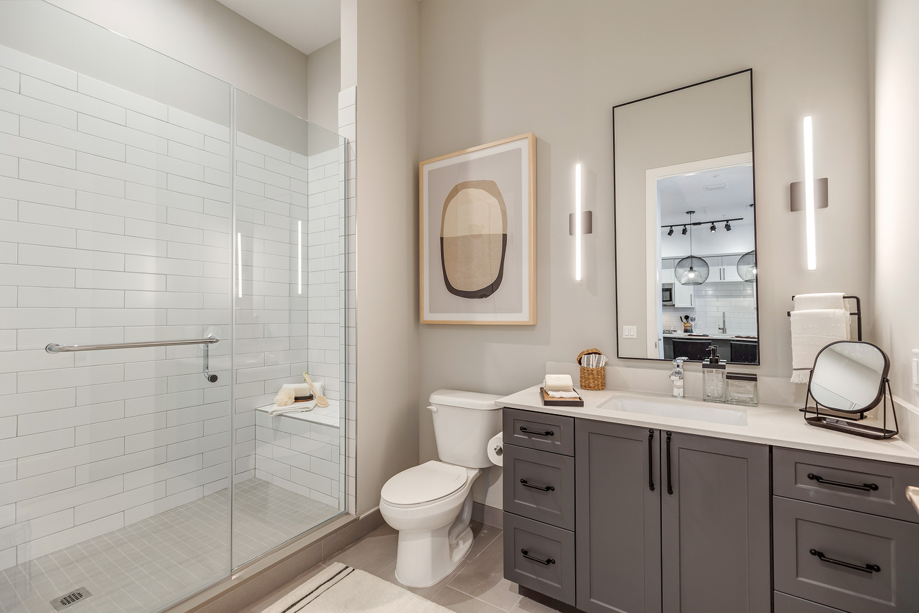 Inside, chef-inspired kitchens gleam with Caesar-stone quartz countertops, expansive islands, oversized sinks, and stainless steel GE appliances. Luxury extends into the bathroom, where you’ll find shaker-style vanities and glass enclosed showers with raindrop showerheads. Each residence is equipped with cutting-edge technology, such as smart thermostats and smart lighting panels, while upgraded penthouses boast marble countertops, back-lit bathroom mirrors, and more.