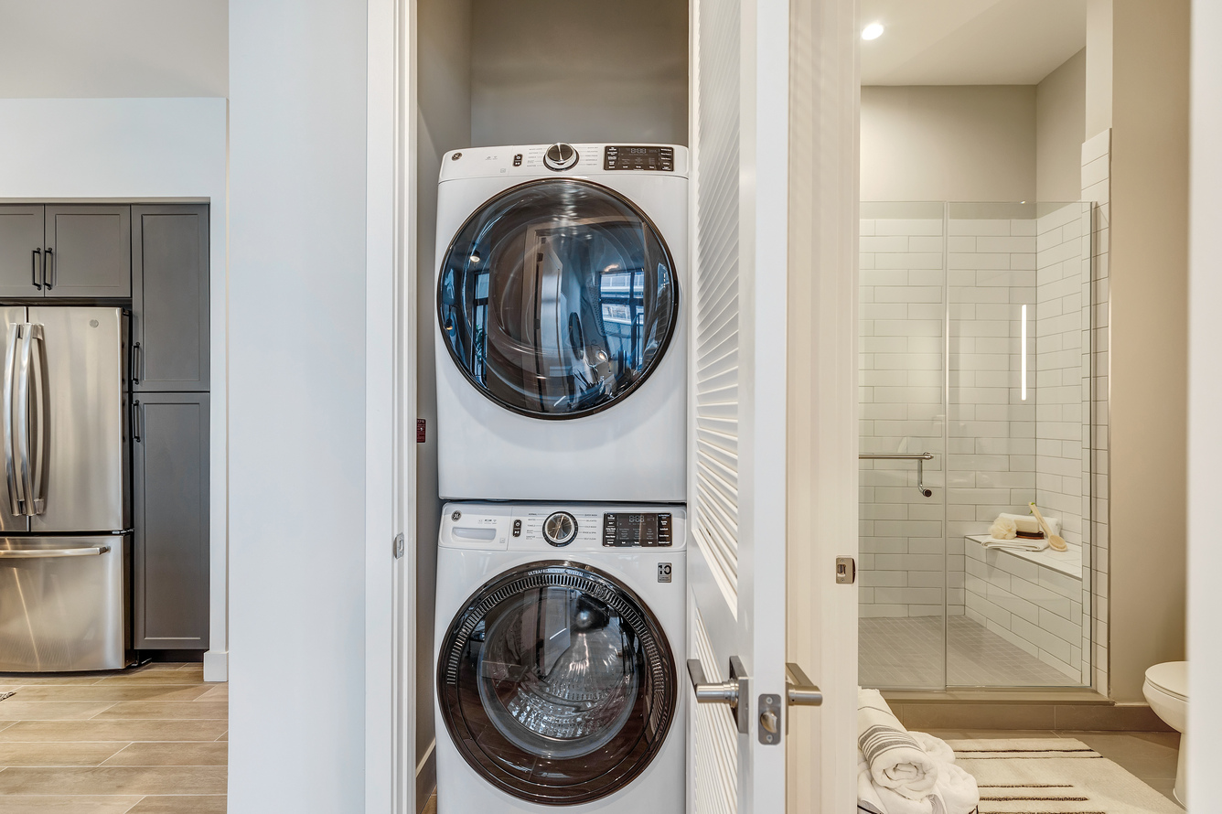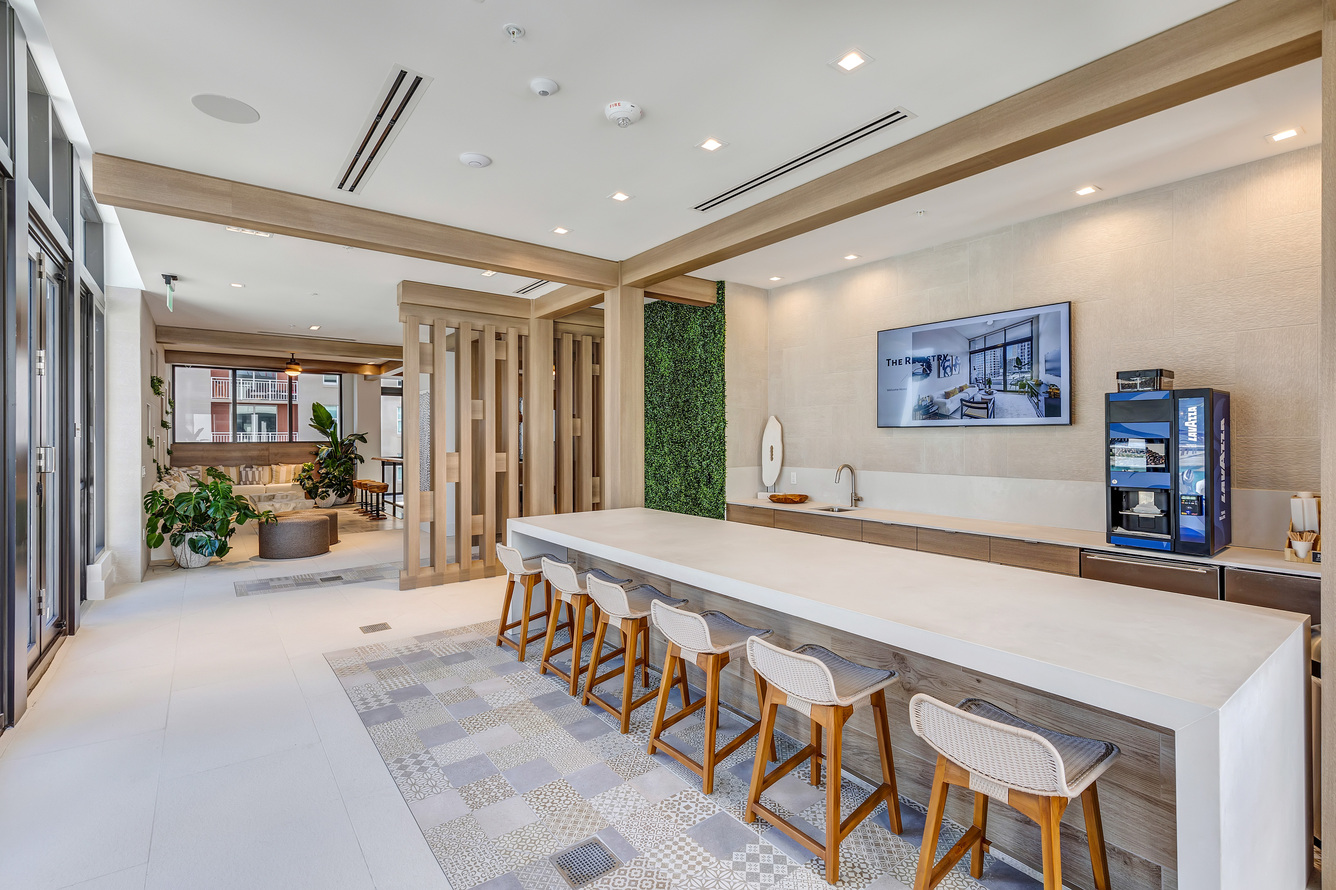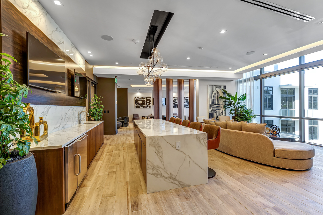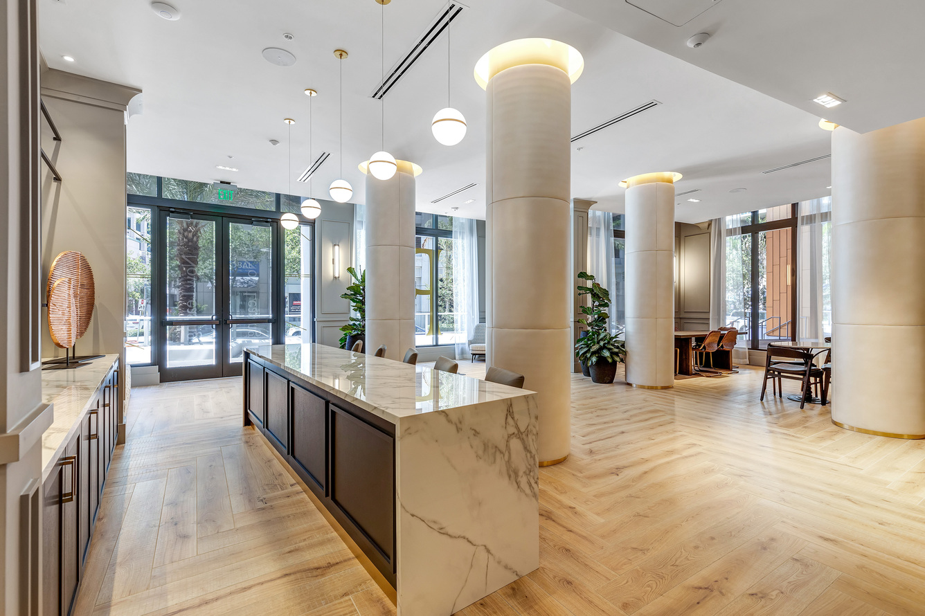 Inside, chef-inspired kitchens gleam with Caesar-stone quartz countertops, expansive islands, oversized sinks, and stainless steel GE appliances. Luxury extends into the bathroom, where you’ll find shaker-style vanities and glass enclosed showers with raindrop showerheads. Each residence is equipped with cutting-edge technology, such as smart thermostats and smart lighting panels, while upgraded penthouses boast marble countertops, back-lit bathroom mirrors, and more.