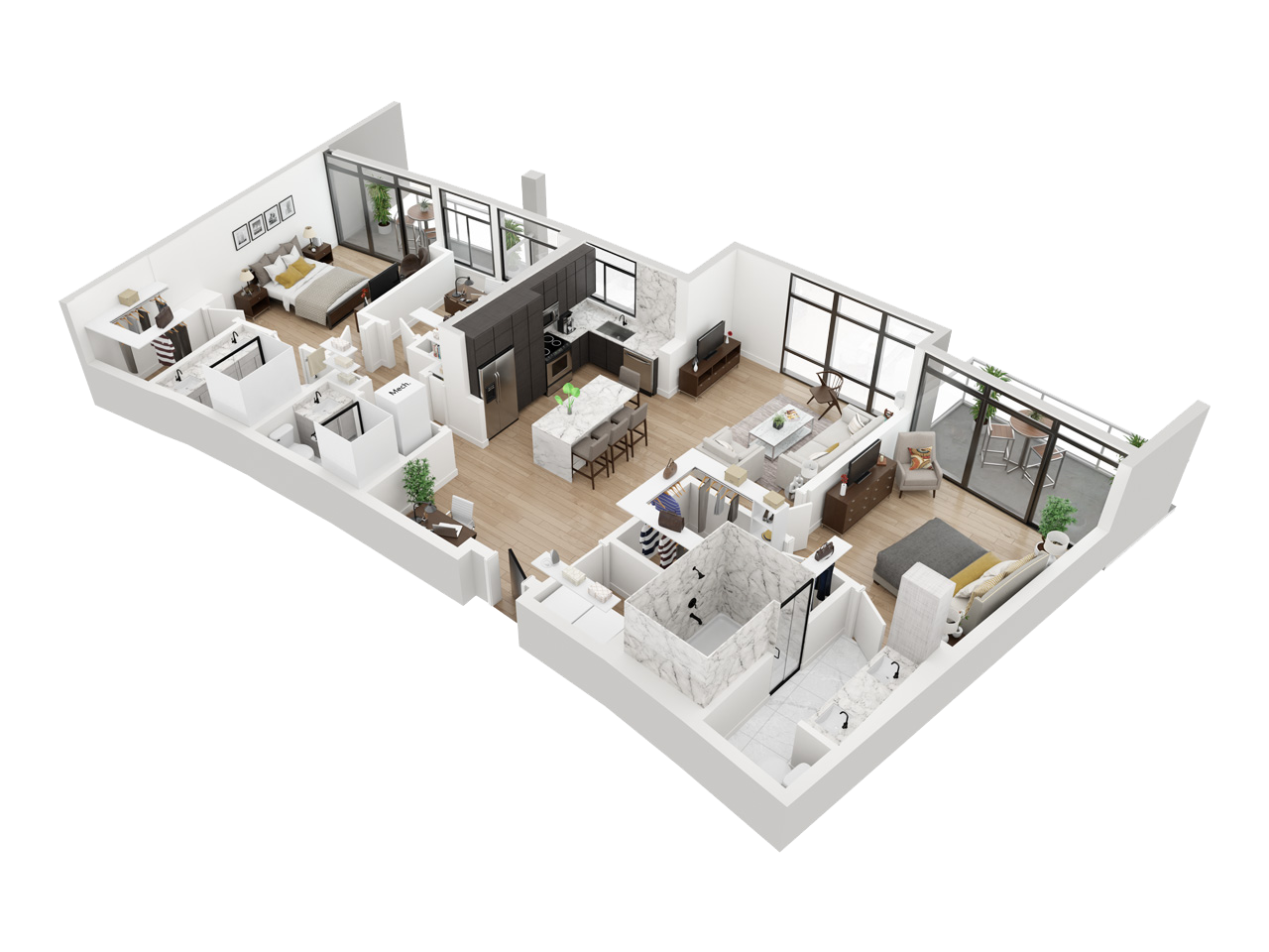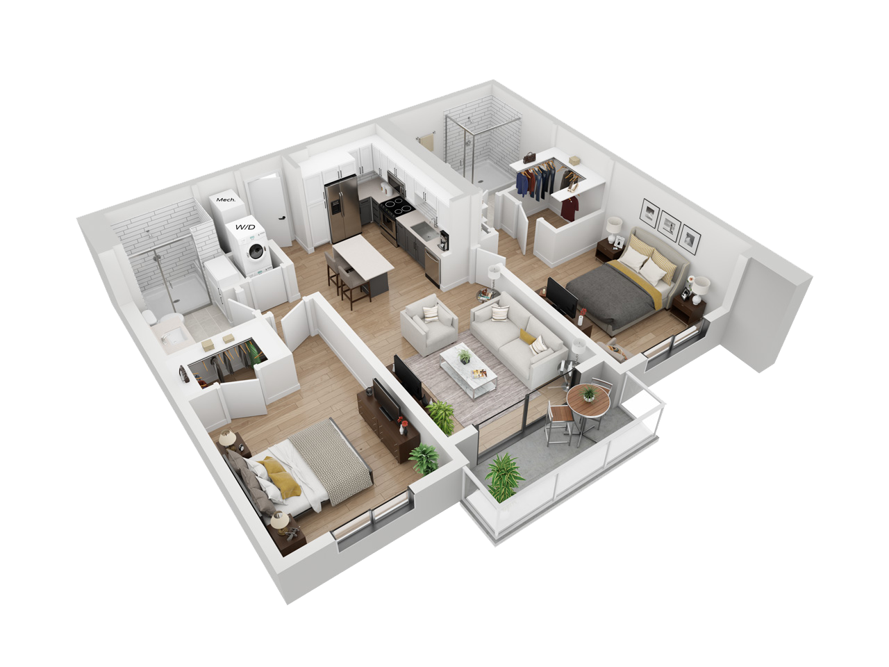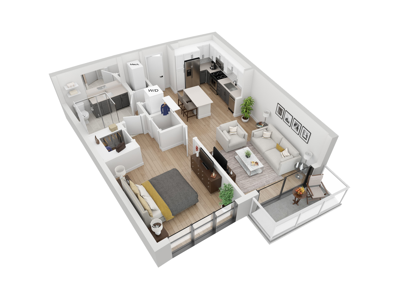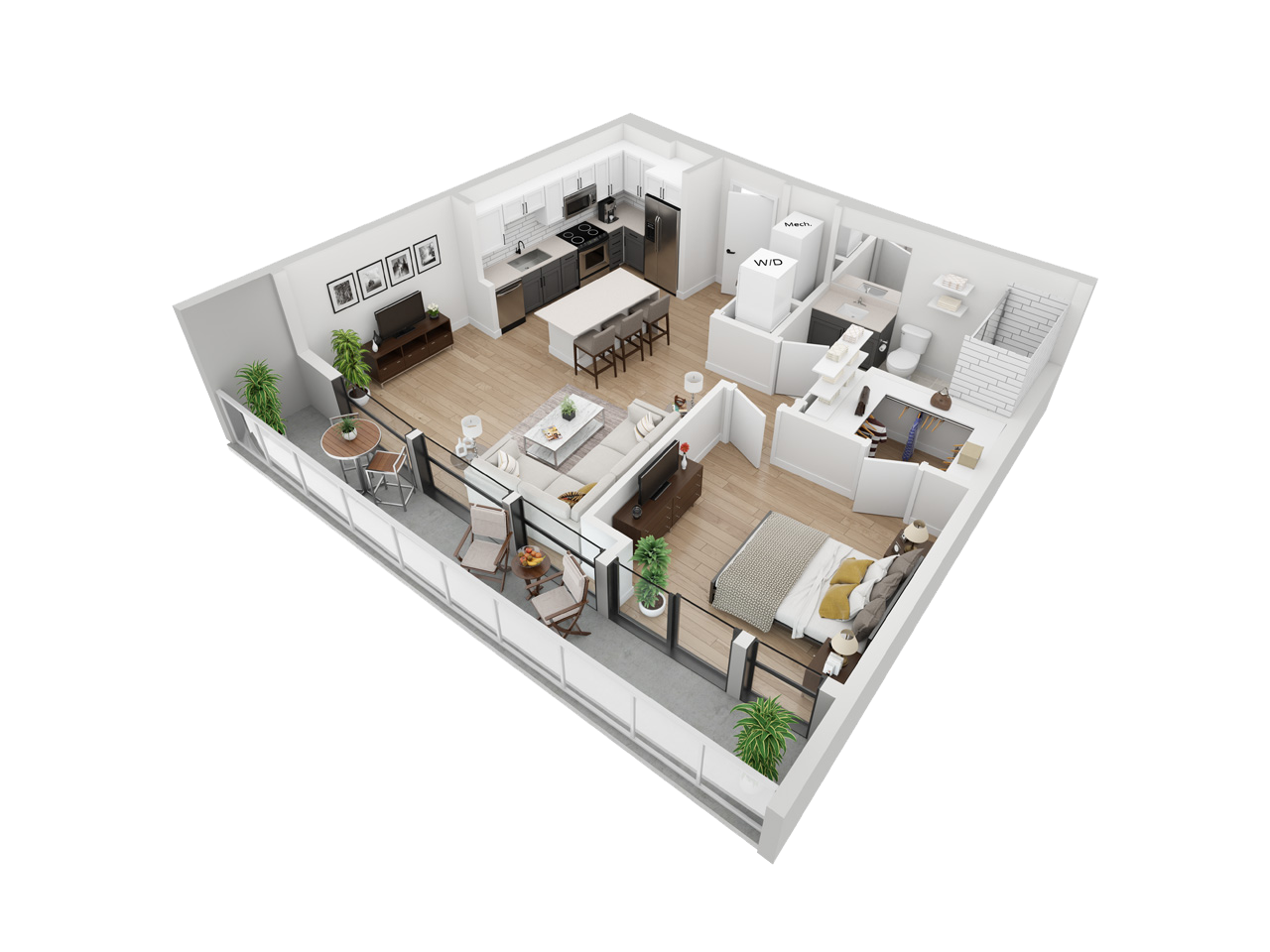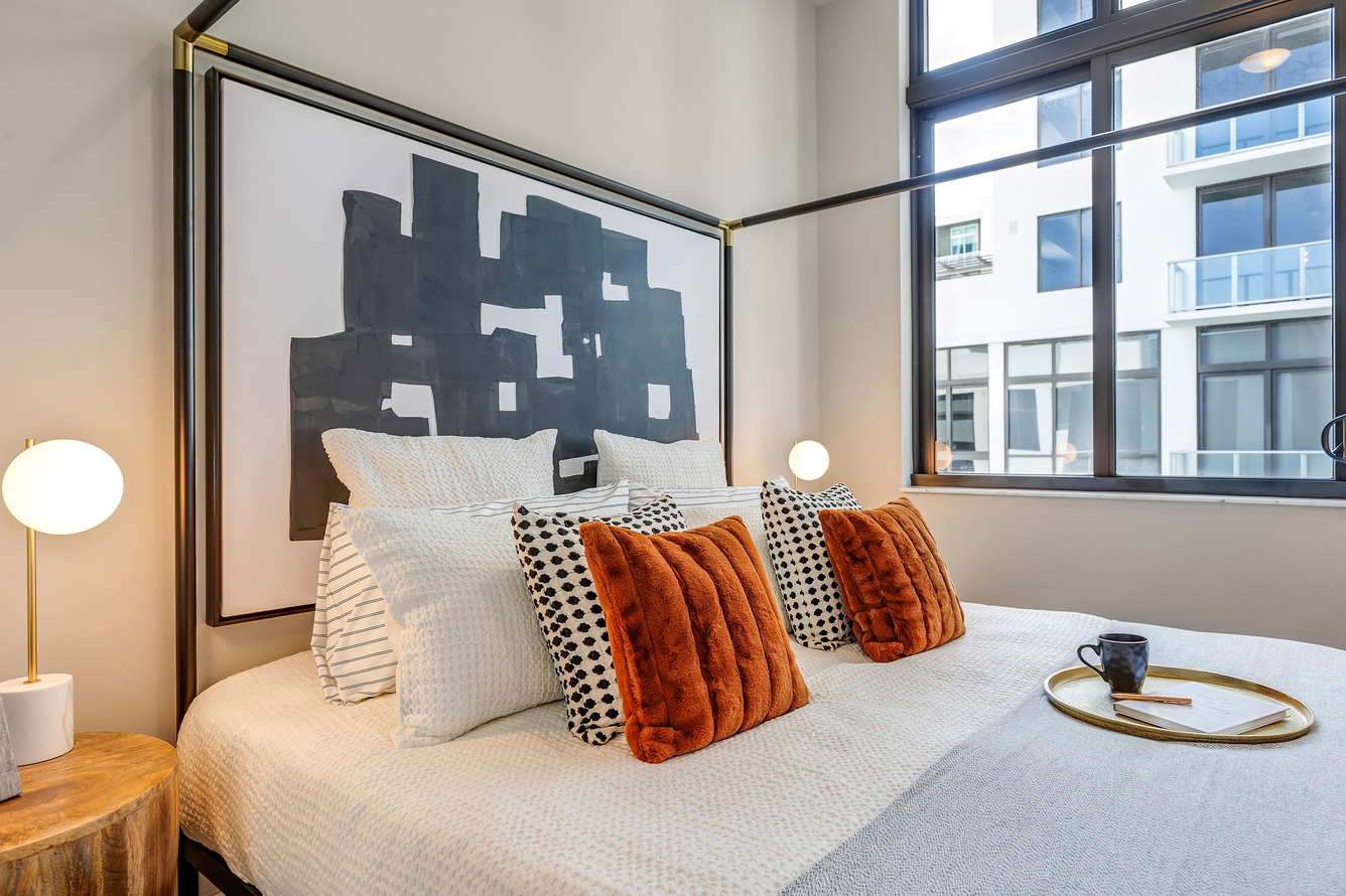 Inside, chef-inspired kitchens gleam with Caesar-stone quartz countertops, expansive islands, oversized sinks, and stainless steel GE appliances. Luxury extends into the bathroom, where you’ll find shaker-style vanities and glass enclosed showers with raindrop showerheads. Each residence is equipped with cutting-edge technology, such as smart thermostats and smart lighting panels, while upgraded penthouses boast marble countertops, back-lit bathroom mirrors, and more.