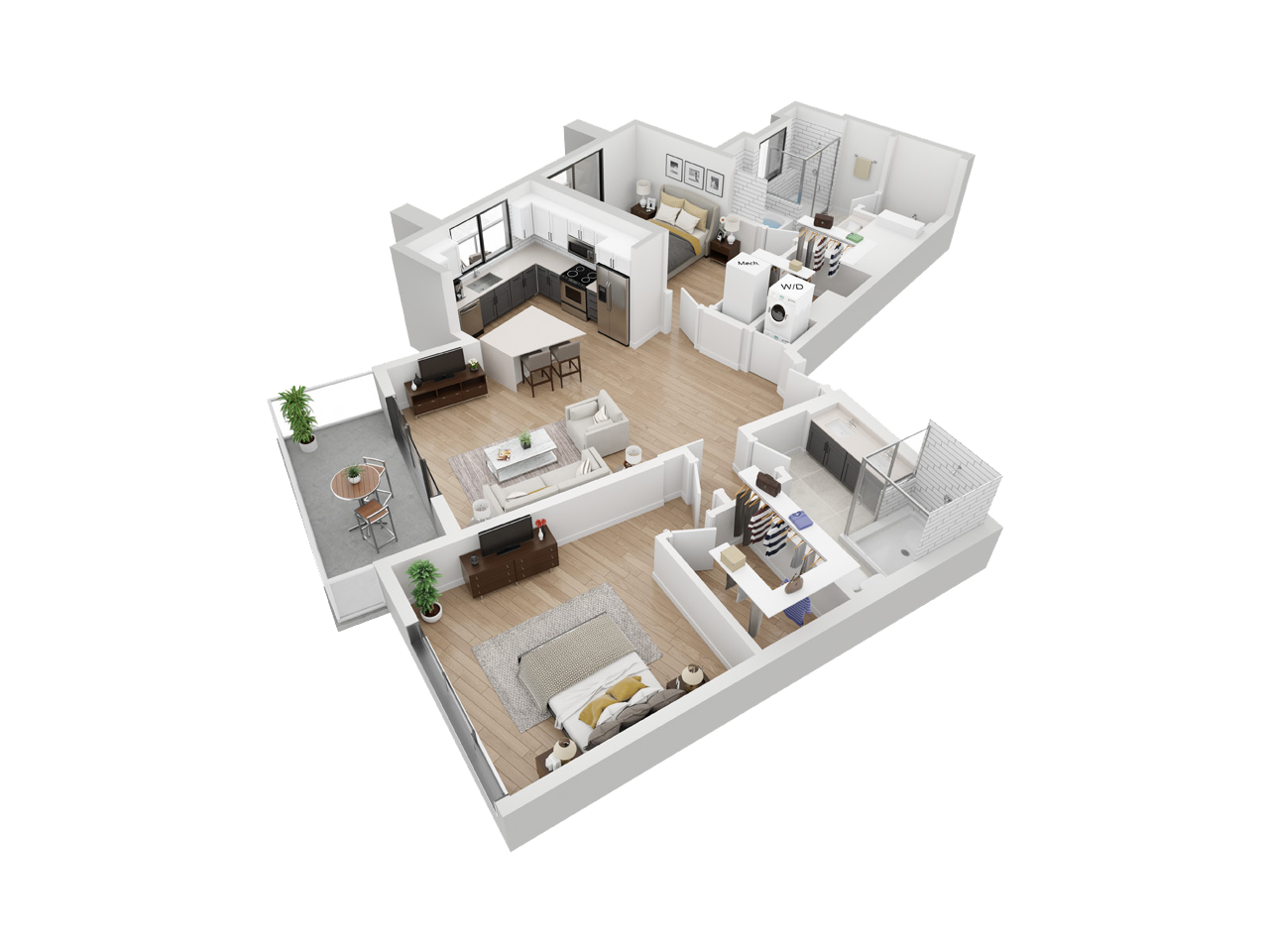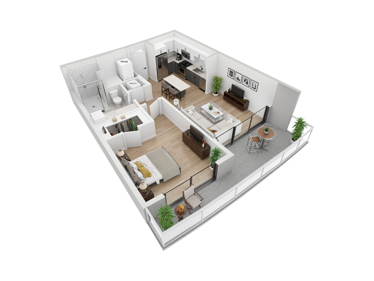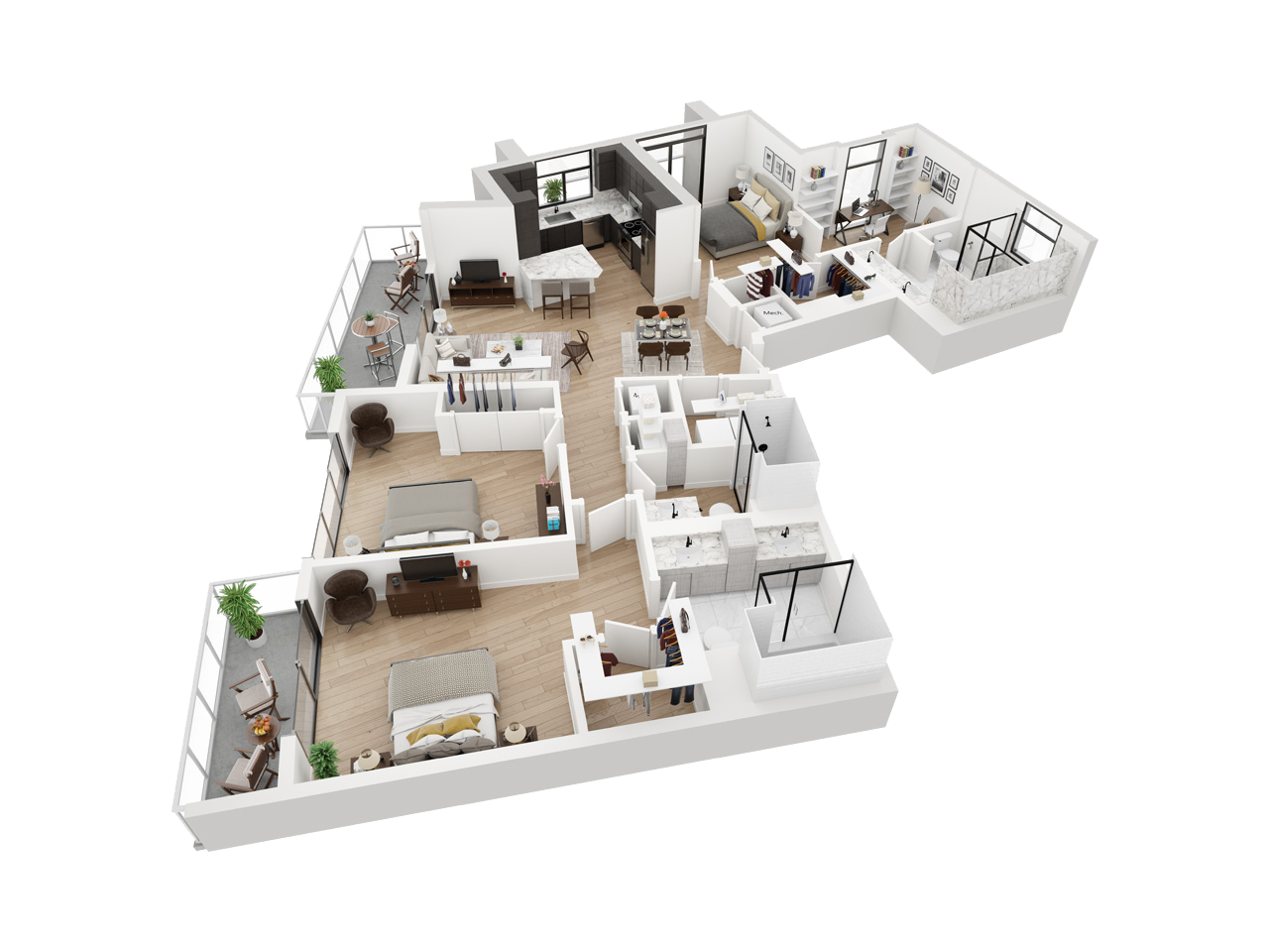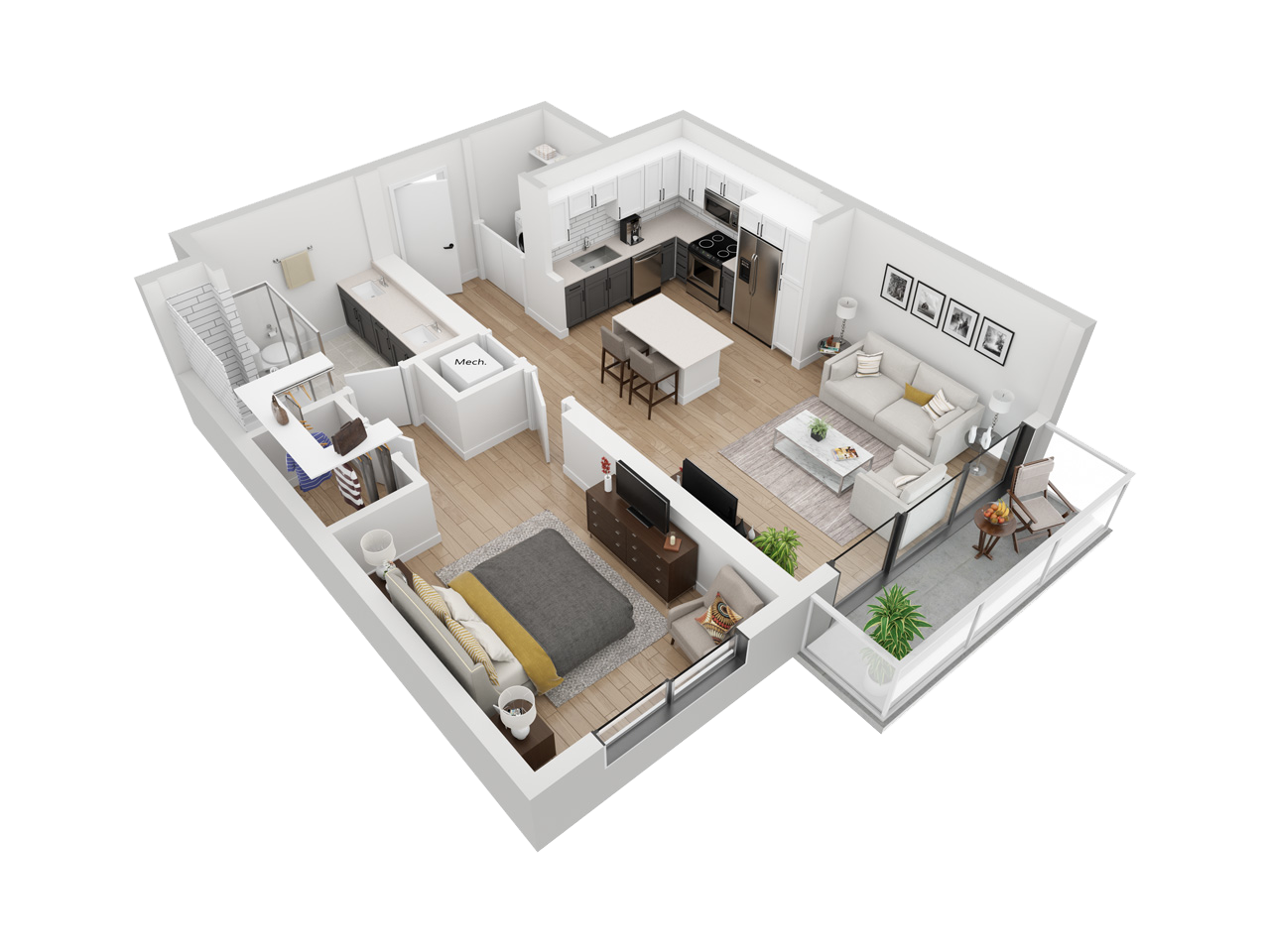 Inside, chef-inspired kitchens gleam with Caesar-stone quartz countertops, expansive islands, oversized sinks, and stainless steel GE appliances. Luxury extends into the bathroom, where you’ll find shaker-style vanities and glass enclosed showers with raindrop showerheads. Each residence is equipped with cutting-edge technology, such as smart thermostats and smart lighting panels, while upgraded penthouses boast marble countertops, back-lit bathroom mirrors, and more.