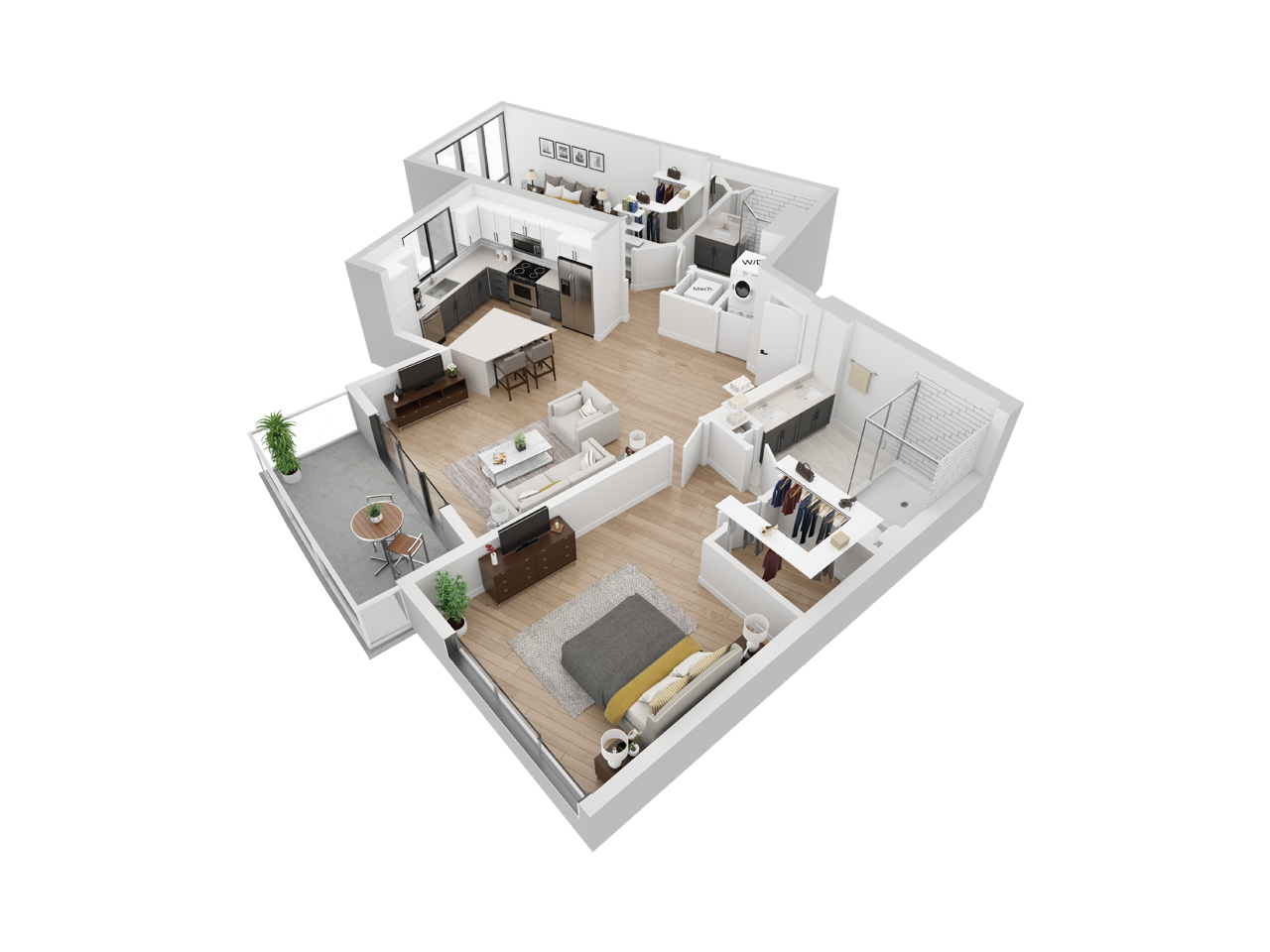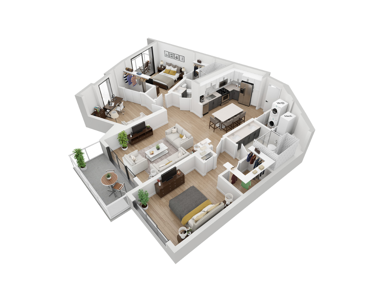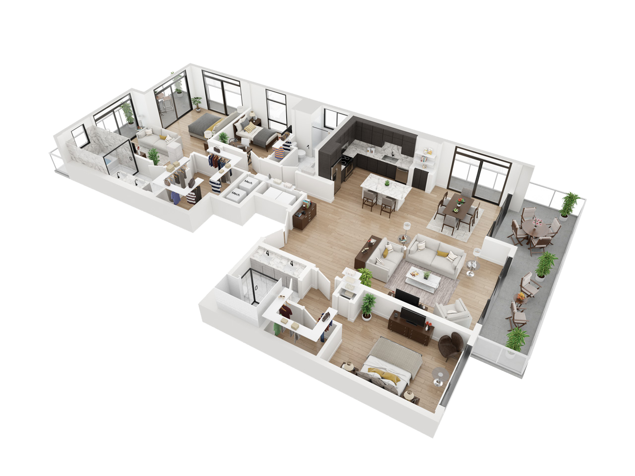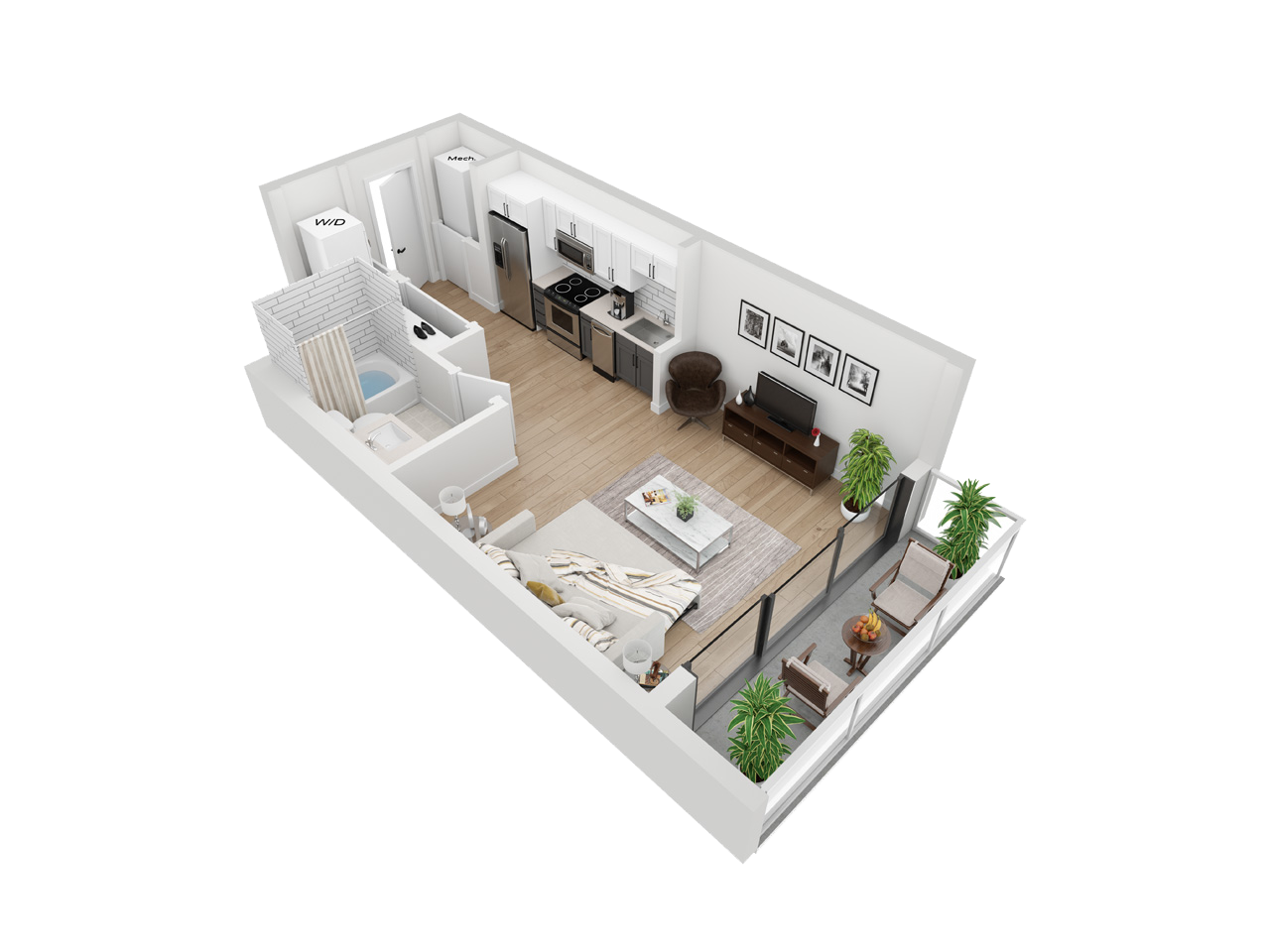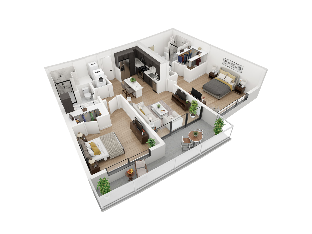 Inside, chef-inspired kitchens gleam with Caesar-stone quartz countertops, expansive islands, oversized sinks, and stainless steel GE appliances. Luxury extends into the bathroom, where you’ll find shaker-style vanities and glass enclosed showers with raindrop showerheads. Each residence is equipped with cutting-edge technology, such as smart thermostats and smart lighting panels, while upgraded penthouses boast marble countertops, back-lit bathroom mirrors, and more.