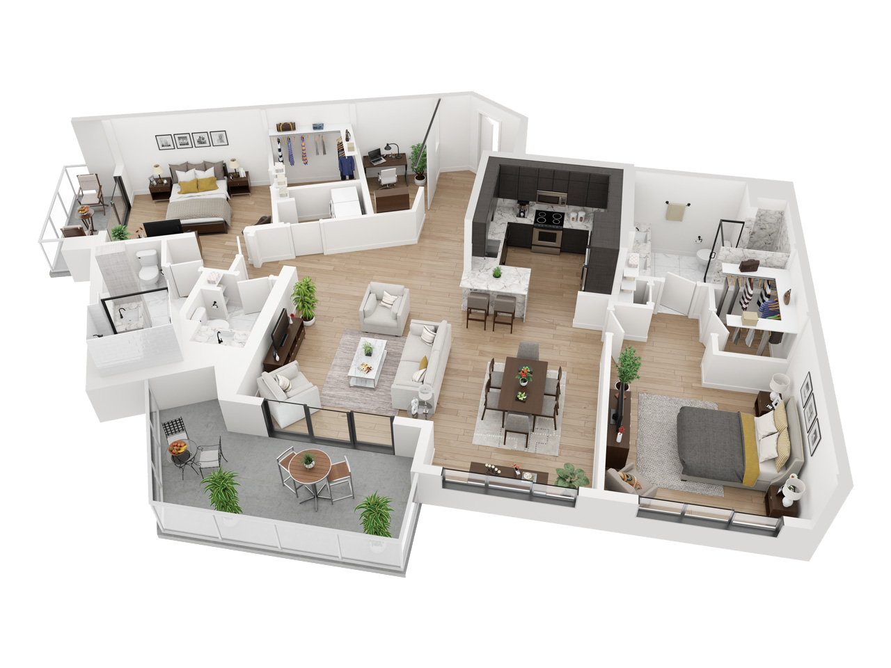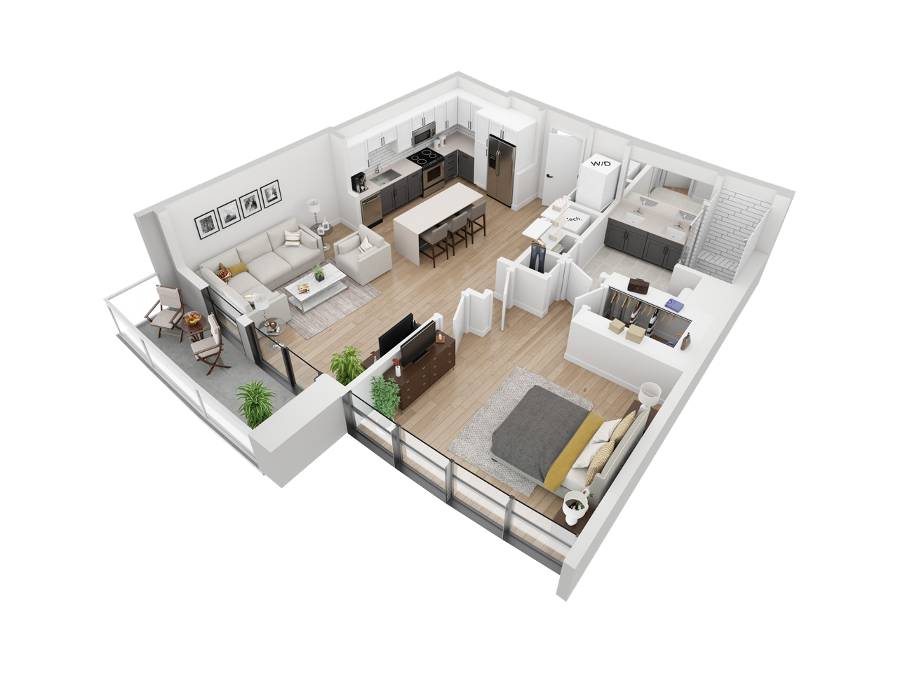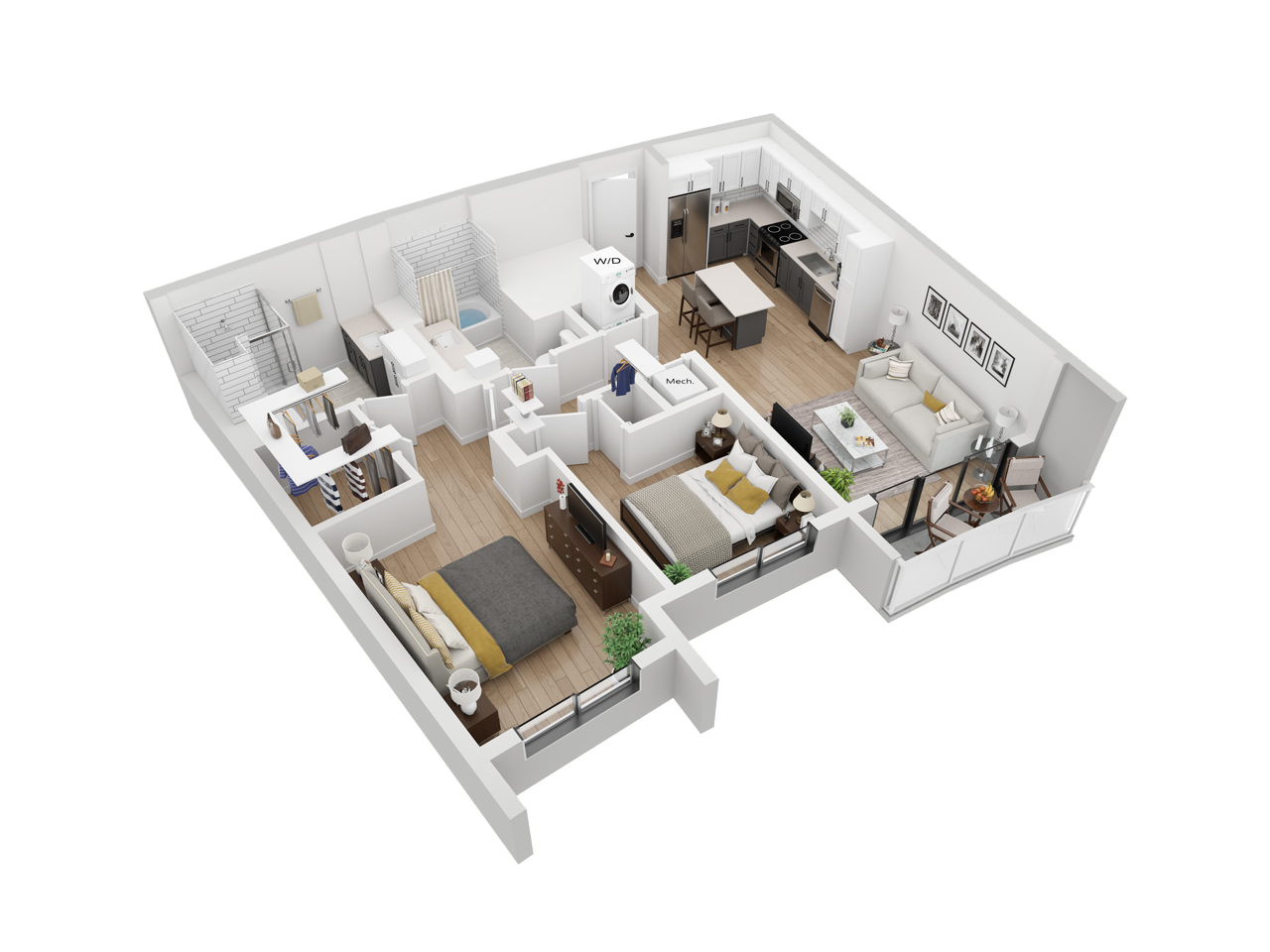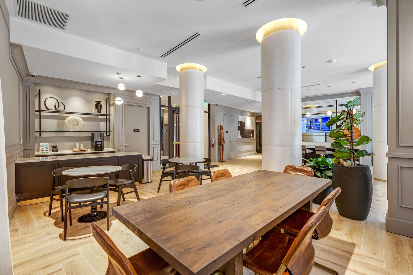 Inside, chef-inspired kitchens gleam with Caesar-stone quartz countertops, expansive islands, oversized sinks, and stainless steel GE appliances. Luxury extends into the bathroom, where you’ll find shaker-style vanities and glass enclosed showers with raindrop showerheads. Each residence is equipped with cutting-edge technology, such as smart thermostats and smart lighting panels, while upgraded penthouses boast marble countertops, back-lit bathroom mirrors, and more.