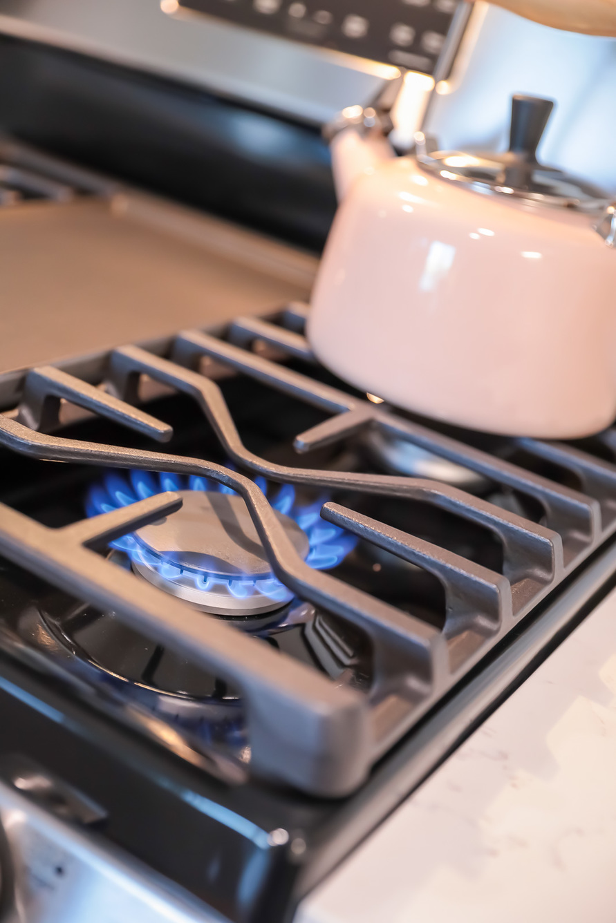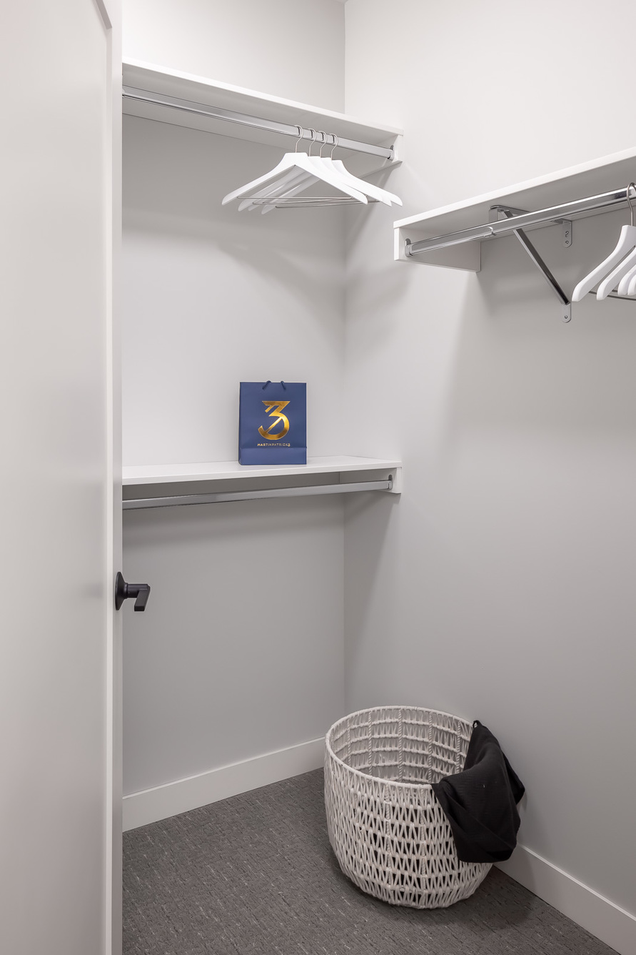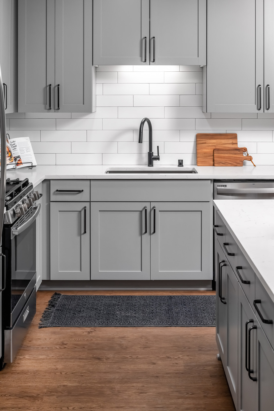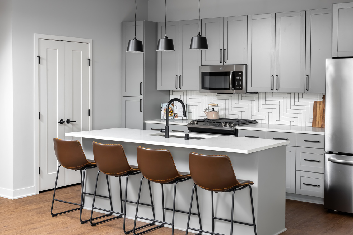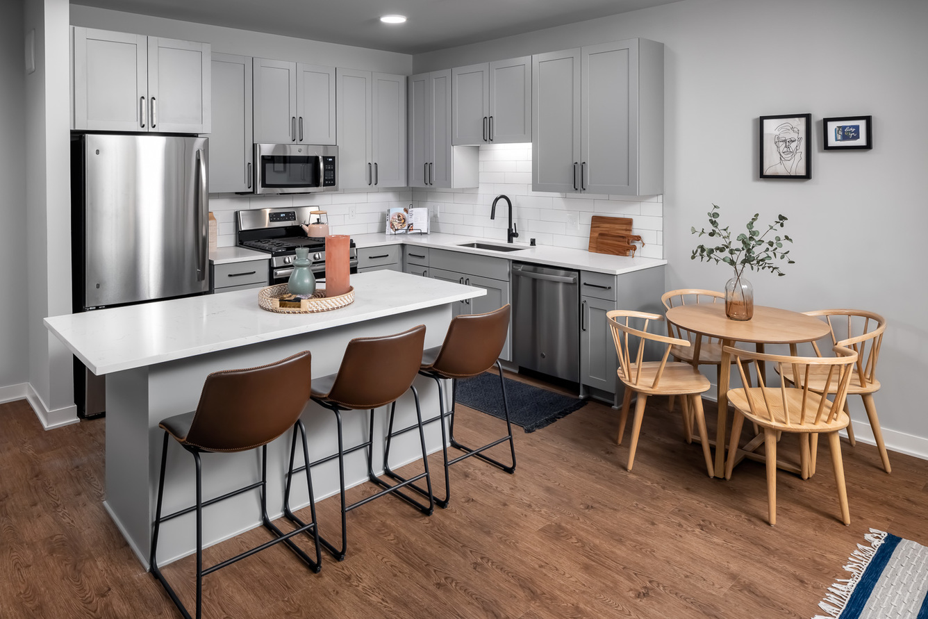 Inside your home, a thoughtfully designed layout gleams with wood-style flooring and an abundance of natural light. In your deluxe kitchen, locally made, painted wood cabinets, energy-efficient GE appliances, and white stone counters allow space to prepare meals and store your cookware. A full-sized washer and dryer set adds convenience while a custom, walk-in closet keeps you organized. After a busy day, soak in the skirted bathtub complete with an elegant tile surround.