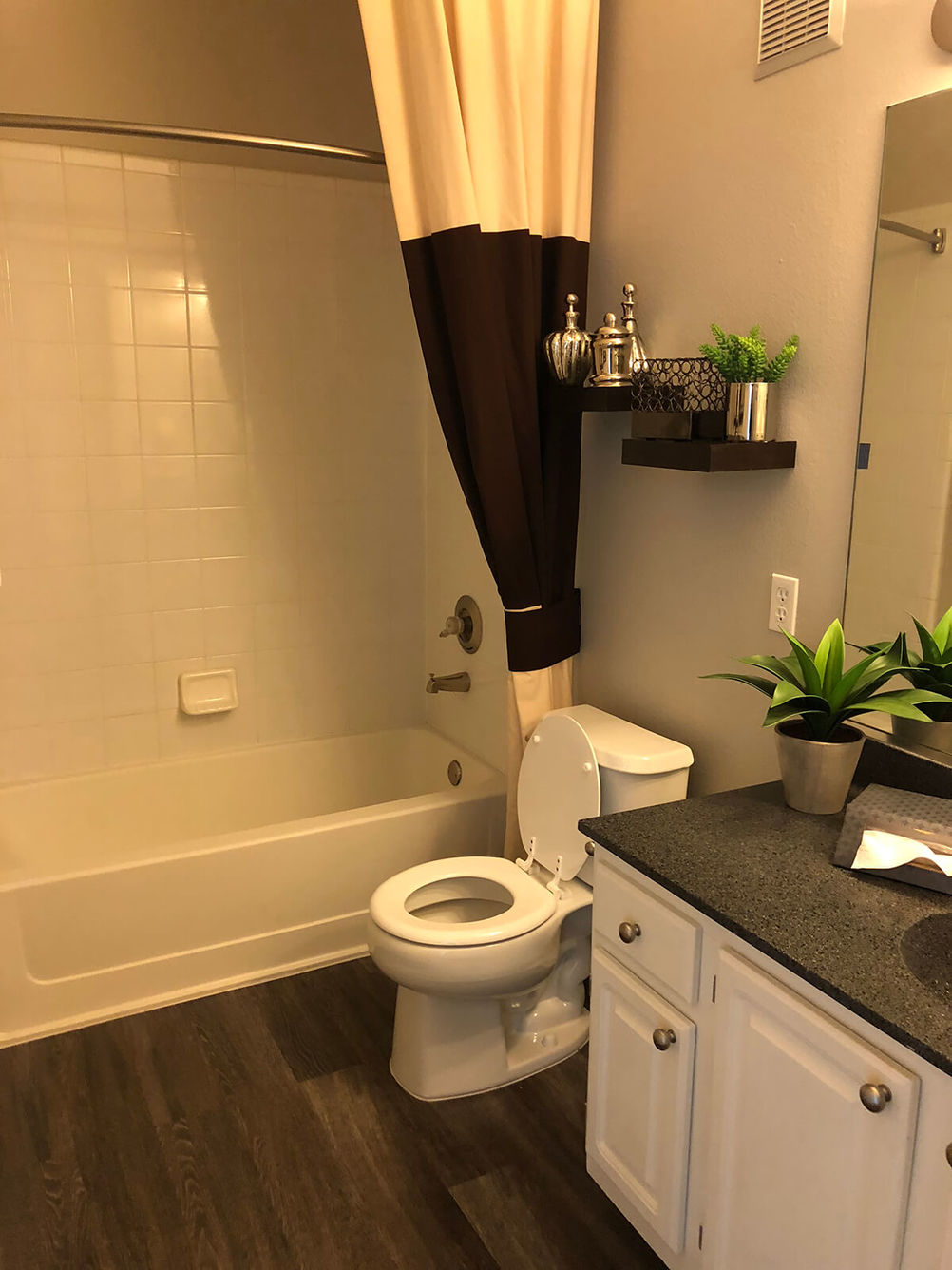 Choose from our one, two, and three bedroom floor plans and come home to a spacious, open-style apartment with soaring nine-foot ceilings. You’ll love the built-in bookshelves available in many of our apartments, as well as the electronic thermostat. On chilly evenings, you can light a fire to warm yourself beside, and on humid days, the large soaking tub offers a place to cool down. Sliding glass doors, which lead to your patio or balcony, allow in plenty of sunshine to create well-lit interiors. Dark wood-style flooring extends from the living room to the kitchen and adds a hint of class and visual contrast to the interior. Enjoy cooking in a stunning, fully equipped kitchen with a breakfast bar. Plush Berber carpeting creates stylish, inviting bedrooms. Walk-in closets, a laundry room, and outdoor storage are available as well.
